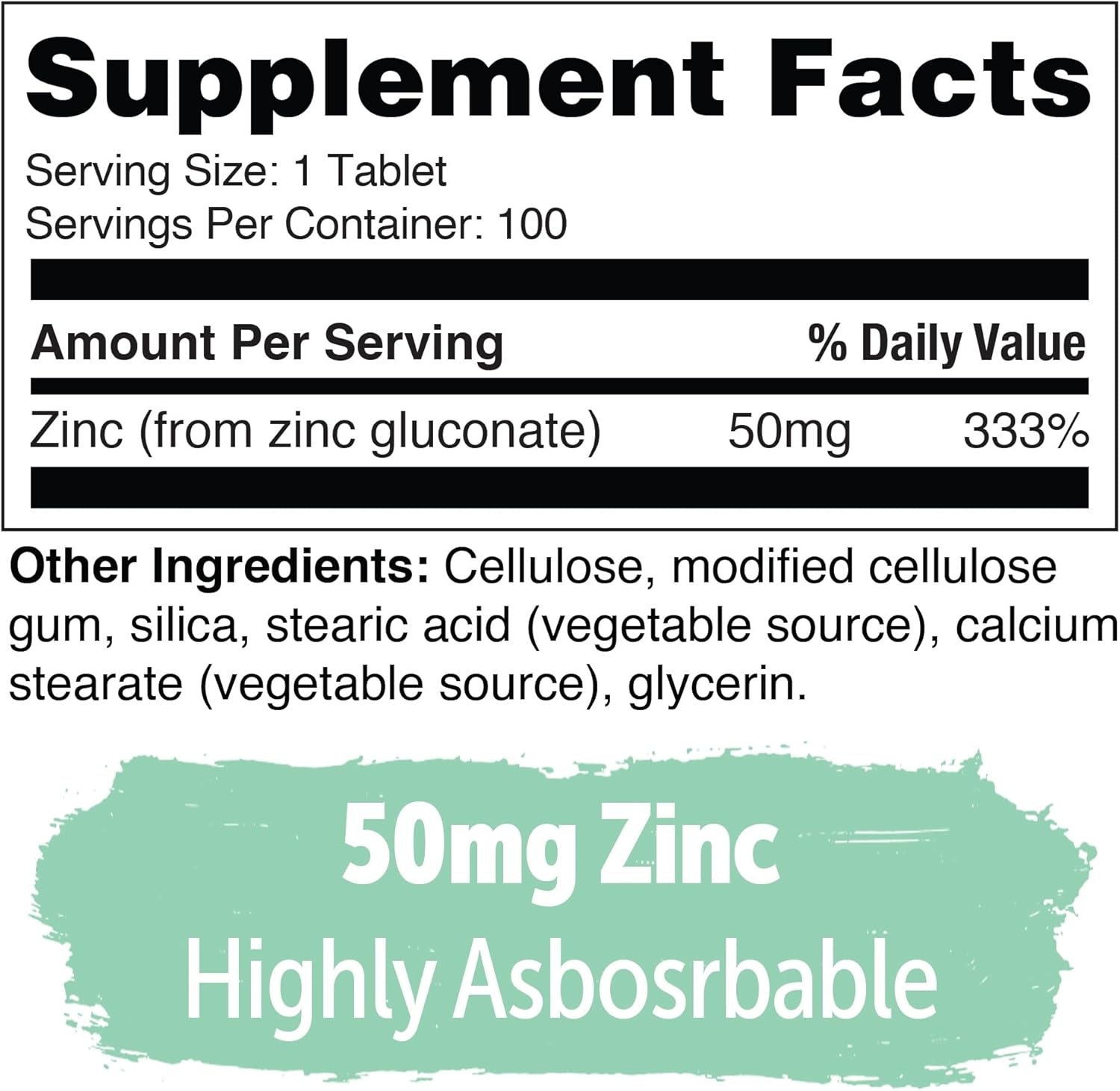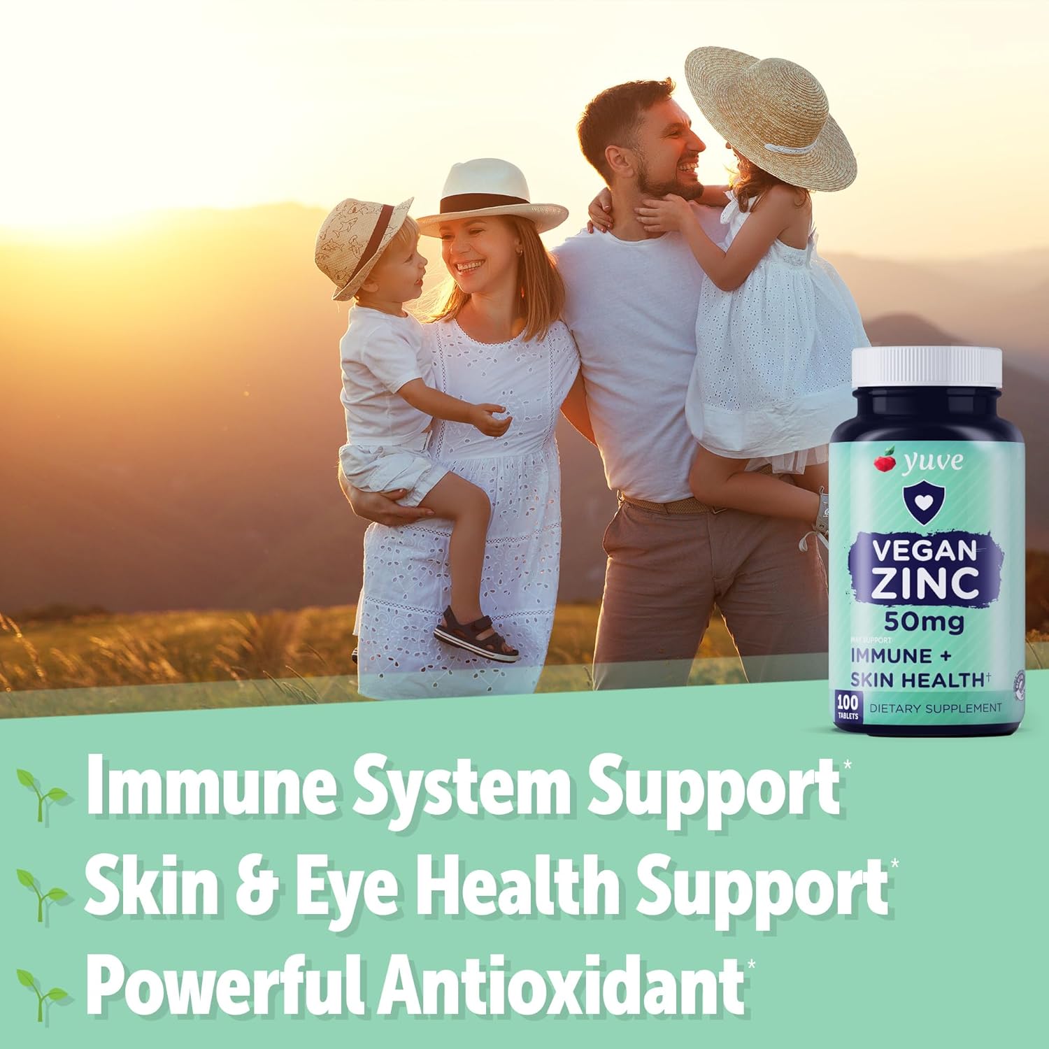 Yuve Natural Vegan Zinc Supplements 50Mg, Immune Support, Fast Relief From Colds And Flu, Acne Free Skin, Healthy Hormone Levels, Non-Gmo, Gluten & Sugar Free - 100 Vegetarian Tablets