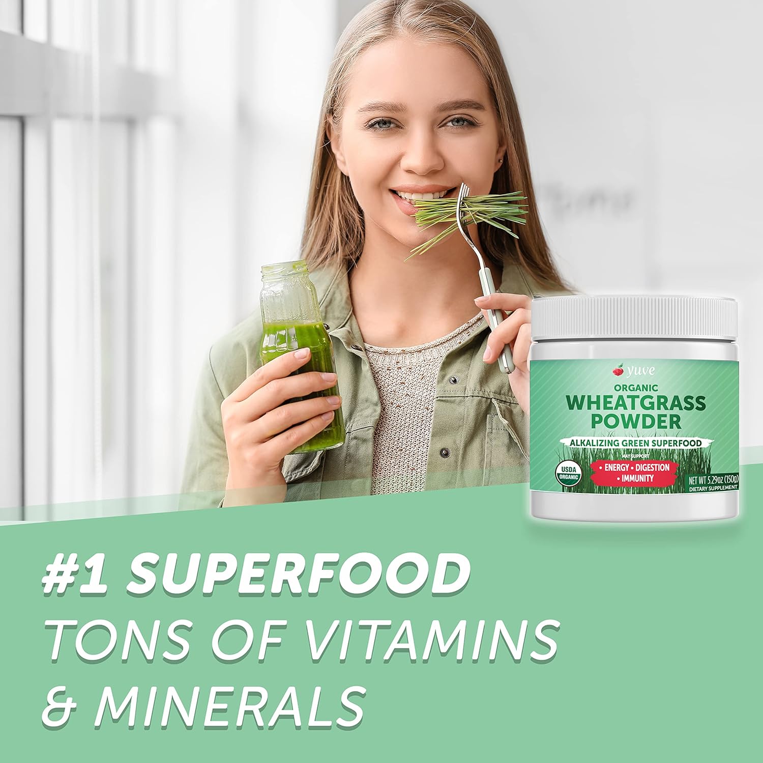 Yuve Usda Organic Wheatgrass Powder - Grown In Usa - Raw, Non-Gmo, Lab Tested - 100% Whole Leaf - Superfood Rich In Vitamins, Antioxidants & Minerals - Gluten-Free - 2 Months Supply - 5.29Oz