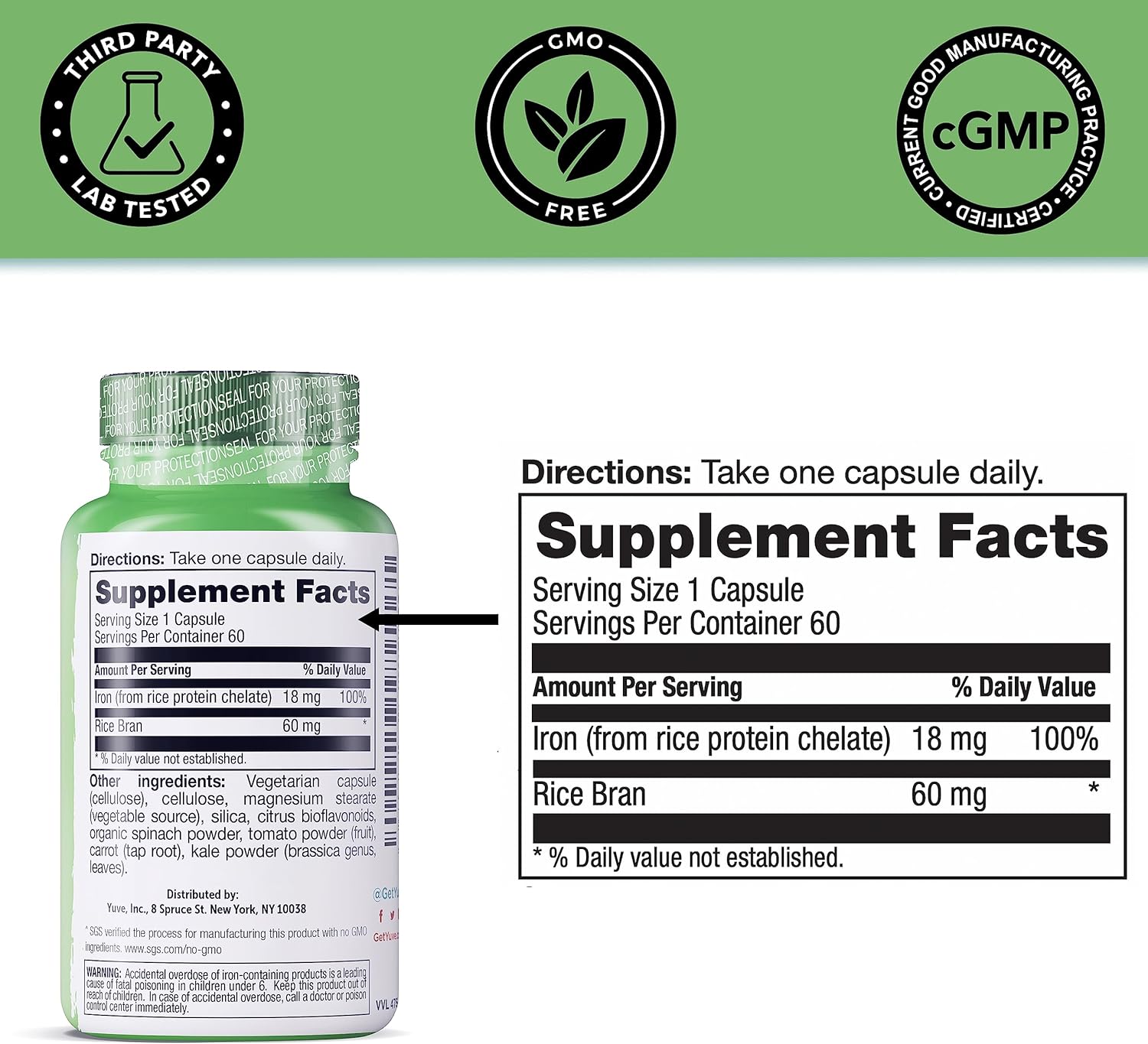 Yuve Whole Food Chelated Iron 18 Mg Supplement - Formulated For Maximum Absorbption - Supports Healthy Heart & Blood Cells - Boosts Energy & Cognitive Functions - Vegan, Non-Gmo, Gluten-Free - 60 Caps