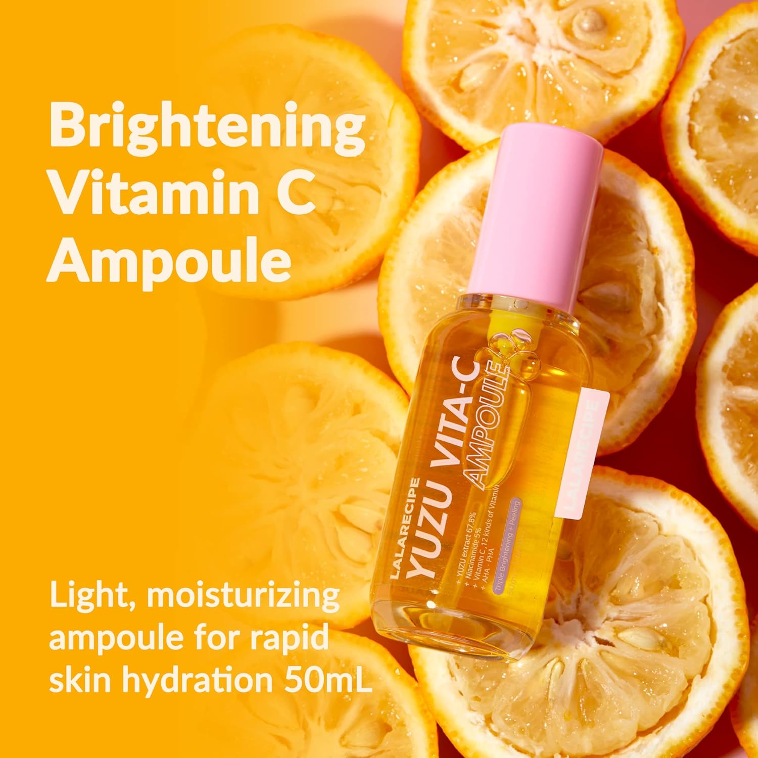Intense Brightening & Hydration: Lalarecipe Yuzu Vita C Ampoule Brightens Dark Spots, Dullness, And Uneven Tone With Vitamin C-Rich Yuzu Extract For A Radiant Glow. Triple Brightening: Features 67.8% Jeju Yuzu, 5% Niacinamide, Arbutin, And Alpha-Bisabolol For Discoloration And Radiance. Korean Formula: Aha, Pha Gently Exfoliate, Vegan Collagen Strengthens Skin, Leaving It Smooth And Firm. Deep Hydration: 12 Vitamins + Hyaluronic Acid Provide Intense Hydration And Elasticity. How To Use: Apply 2-3 Drops After Cleansing And Toning, Then Pat For Absorption