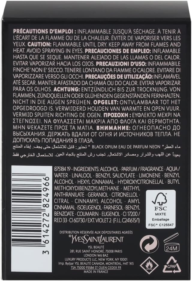 Product Description Yves Saint Laurent - Opium neon black Eau de Parfum. She is the woman neon black Opium, the luminescent heroine of the urban night. Its scent is bold. Addictive. Irresistibly transgressive. What he wants is to stand out... Feel the speed of light and shine until Dawn. More spectacular than ever, the bottle glows with a black glow that characterizes the bold elegance of rock black Opium. The unexpected meeting of the iconic black coffee with the bold notes of dragon fruit. A vibrant and bright dependence that shines all night. Top notes: dragon fruit agreement, essence of mandarin. Heart notes: agreement of orange blossom, sambac jasmine absolute, agreement of hibiscus flowers; base notes: Black coffee agreement, agreement vanilla. Safety Warning For external use only. Avoid contact with eyes. Keep away from naked flame or direct heat sources,Daring and irresistibly unconventional perfume,Fragrance bold elegance,Meeting between black coffee and dragon fruit notes,Model number: 3614272824973