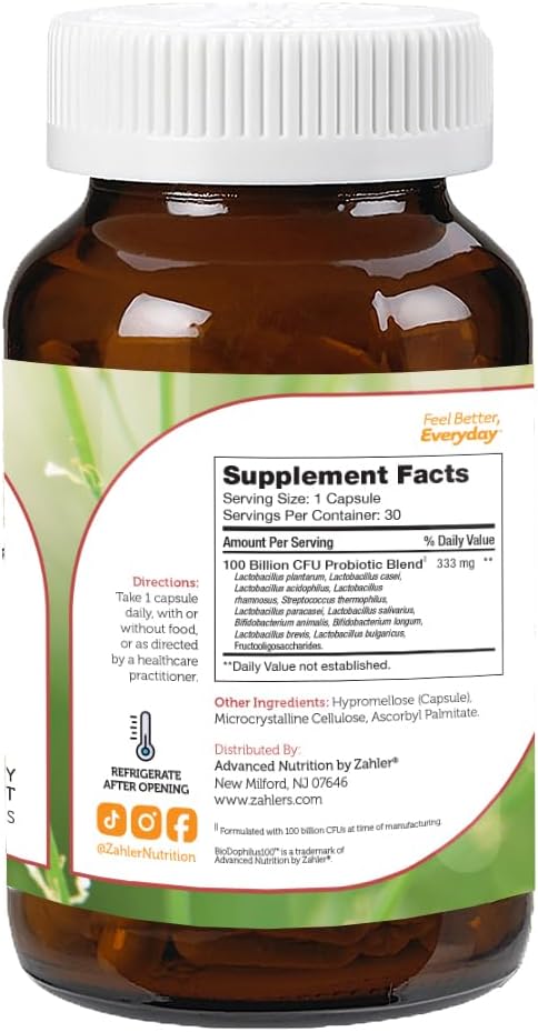 Zahler Biodophilus100, All Natural Advanced Probiotic Acidophilus Supplement, Promotes Digestive Health, 100 Billion Live Cultures And Intestinal Flora Per Serving, Certified Kosher,30 Capsules