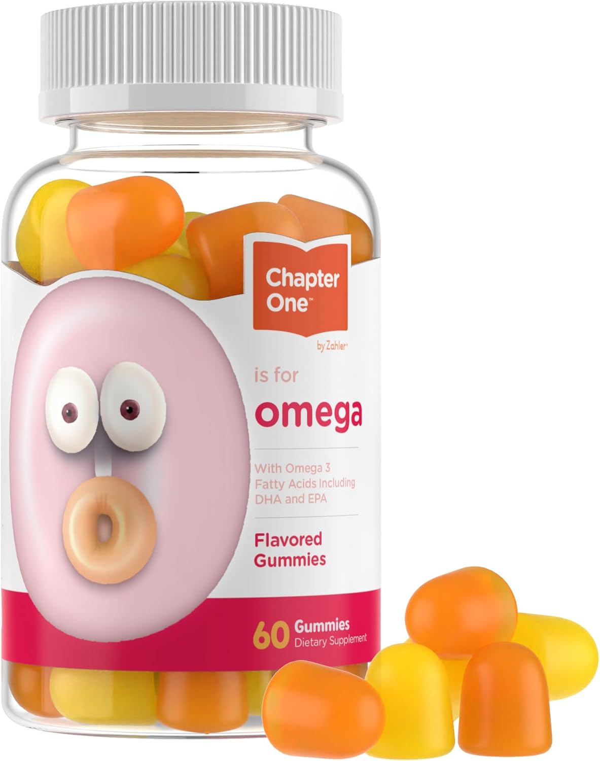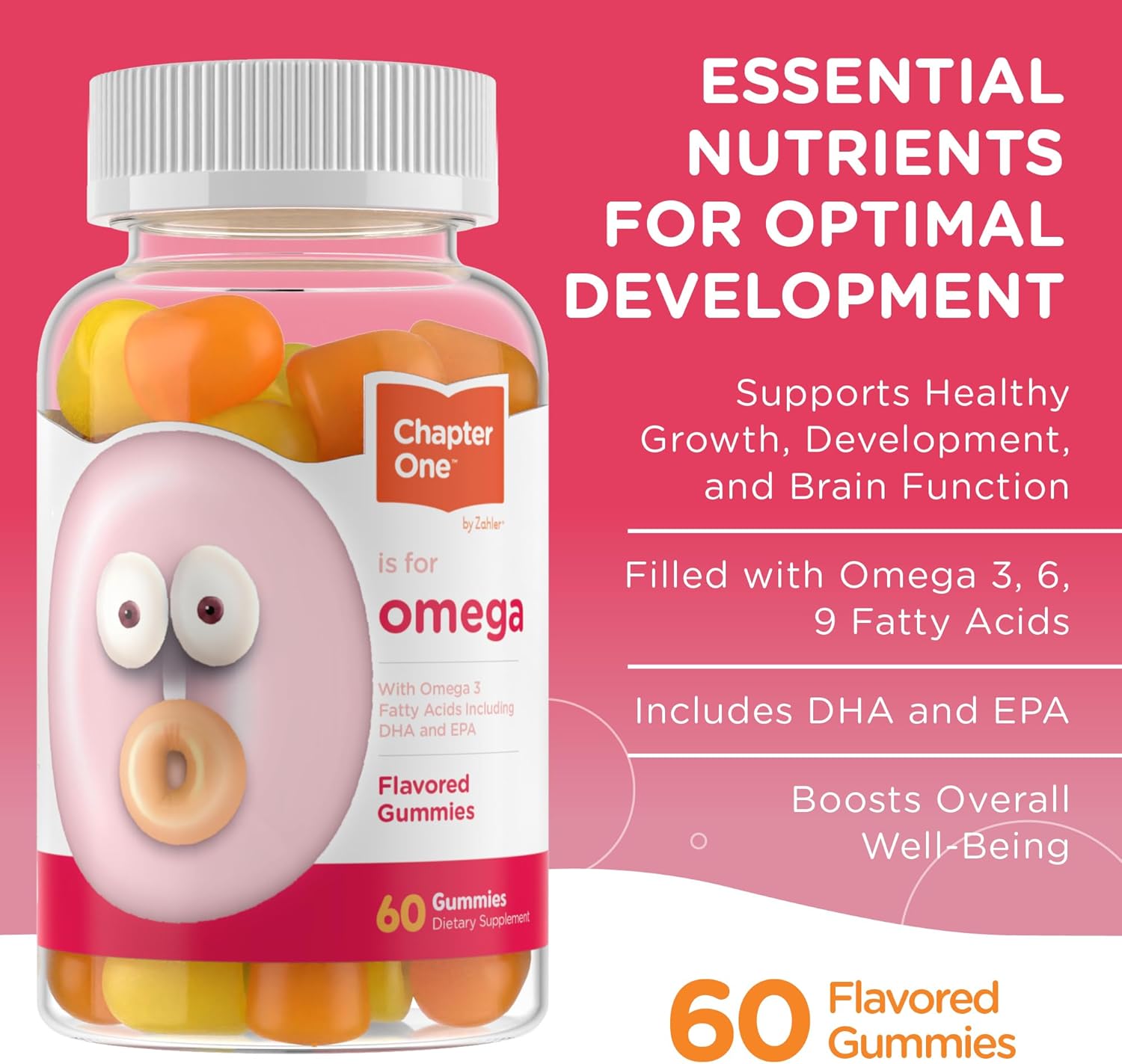 About this item ALL THE OMEGA ESSENTIALS - These chewable omega gummies are unlike kids fish oil gummies because the omega-3 fatty acids 3, 6 and 9 along with DHA and EPA come from chia oil and algae instead of marine fish sources, providing children with an allergen free option for omega3. KIDS HEALTHY DEVELOPMENT - Chapter One gummy omega 3 vitamins are formulated to support healthy growth, development, brain function, and overall health which can benefit children at home, in the classroom, and throughout the night. Kid tested, mom approved! IRRESISTIBLE FRUIT FLAVOR - No more pills... No more fishy burps or bad aftertaste... Chapter One omega 3 EPA DHA gummies have a delicious fruity flavor and vegan ingredients that will have them begging for more! Great for kids who don't eat fish or don't like swallowing pills. CERTIFIED KOSHER - Chapter One omega 3 oil supplements are certified Kosher. Each serving is fish oil free, peanut free, tree nut free, dairy free, gluten free, soy free and egg free to be suitable for children with dietary restrictions and/or sensitivities. MADE IN THE USA - Zahler uses state of the art GMP certified facilities to help ensure potency and purity of all our dietary supplements. This product is Non GMO and Certified Kosher with pure, unadulterated ingredients sourced from nature. See more product details,ALL THE OMEGA ESSENTIALS - These chewable omega gummies are unlike kids fish oil gummies because the omega-3 fatty acids 3, 6 and 9 along with DHA and EPA come from chia oil and algae instead of marine fish sources, providing children with an allergen free option for omega3,KIDS HEALTHY DEVELOPMENT - Chapter One gummy omega 3 vitamins are formulated to support healthy growth, development, brain function, and overall health which can benefit children at home, in the classroom, and throughout the night. Kid tested, mom approved!,IRRESISTIBLE FRUIT FLAVOR - No more pills... No more fishy burps or bad aftertaste... Chapter One omega 3 EPA DHA gummies have a delicious fruity flavor and vegan ingredients that will have them begging for more! Great for kids who don't eat fish or don't like swallowing pills,CERTIFIED KOSHER - Chapter One omega 3 oil supplements are certified Kosher. Each serving is fish oil free, peanut free, tree nut free, dairy free, gluten free, soy free and egg free to be suitable for children with dietary restrictions and/or sensitivities,MADE IN THE USA - Zahler uses state of the art GMP certified facilities to help ensure potency and purity of all our dietary supplements. This product is Non GMO and Certified Kosher with pure, unadulterated ingredients sourced from nature