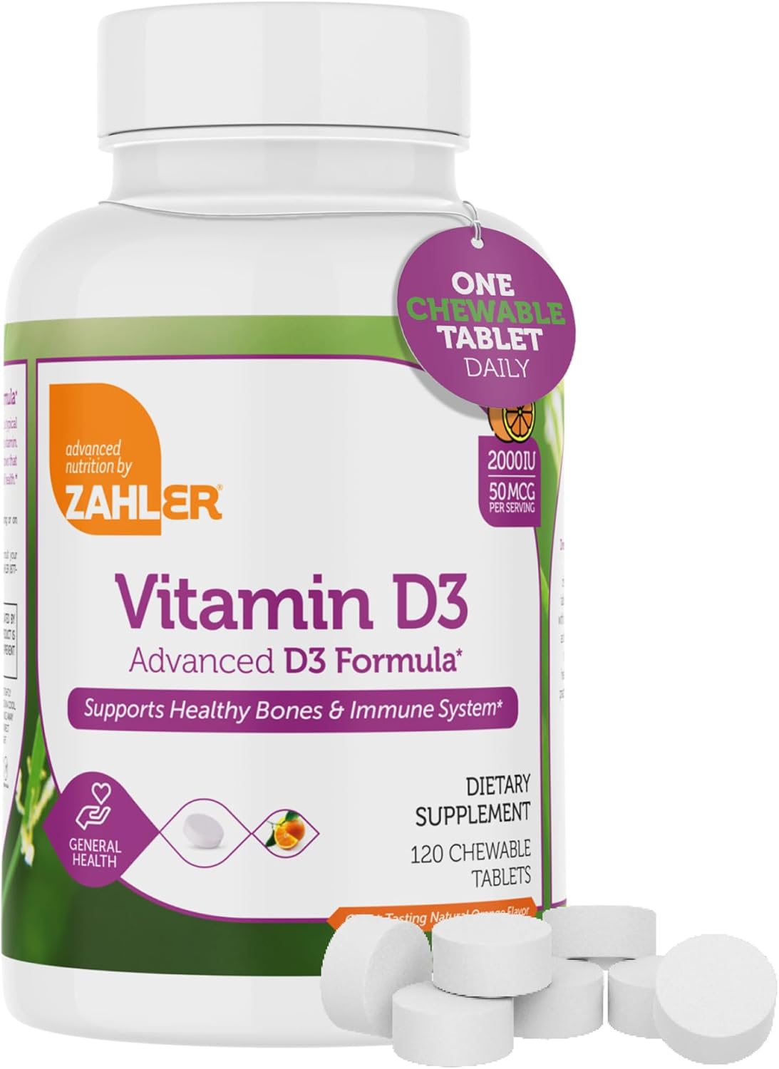 Taking care of your health should be simple and satisfying. Zahler’s Vitamin D3 2000 IU Chewable Tablets make it easy and enjoyable to support your wellness. With a delicious natural orange flavor, these chews deliver 2000 IU (50 mcg) of vitamin D3 to support healthy bones and your immune system. Offering the perfect blend of great taste and convenience, these tablets make it easier than ever to stay on top of your health. Ideal for on-the-go support – you don’t need water to take them. With a delicious natural orange flavor, they turn your boring vitamin routine into something you’ll actually look forward to! SUPPLEMENT FACTS: Serving Size: 1 Tablet Vitamin D3 - 50 mcg (2000 IU) PRODUCT FEATURES: 2000 IU Chewable Tablets Supports Healthy Bones, Teeth, and Immune System* Natural Orange Flavor Non-GMO Vegetarian Kosher Made in USA Free from Gluten, Dairy, Soy, Egg, Peanuts, Tree Nuts, and Artificial Preservatives DELICIOUSLY EASY-TO-USE SUPPORT Enjoy the benefits of Vitamin D3 in a format that fits your lifestyle. These naturally orange-flavored chewables combine the support your body needs with a taste you’ll love – providing a refreshing alternative to traditional supplements. ADVANCED NUTRITION BY ZAHLER Zahler delivers on nature’s promise by harvesting its many natural resources, opting for 100% pure, authentic, strictly Kosher ingredients. Focusing on underlying deficiencies as opposed to superficial symptoms, our formulas offer a healthy, effective path toward comprehensive wellbeing. * These statements have not been evaluated by the Food and Drug Administration. This product is not intended to diagnose, treat, cure, or prevent any disease,A TASTY WAY TO STAY HEALTHY - Tired of swallowing pills Try enjoying your daily dose of vitamin D 2000IU (50mcg) with a delicious natural orange flavor! These vitamin D chewables make it easy to support your bone health, immune system, and overall wellness,VITAMIN D3 2000 IU CHEW - Perfect for anyone who prefers a vitamin D3 chewable option over pills or capsules, these D3 vitamin 2000 IU chewable tablets are easy and travel-friendly. No water, no hassle—just a quick tasty way to take care of your health every day,STRONGER BONES & TEETH - Vitamin D 3 boosts calcium absorption in the body, which means vit D plays a key role in bone density and helps your teeth be healthy and strong. Whether you're staying active now or investing in your long-term health, it's the foundation for strength that lasts a lifetime,IMMUNE SYSTEM SUPPORT - Life's demands and seasonal changes can test your immune defenses. These vitamin D chewables for adults give you the essential vit D3 support you need to feel healthy and energized, especially during months with low sunlight and higher rates of illness,MADE WHOLESOME IN THE USA - Zahler uses state-of-the-art GMP certified facilities to guarantee the potency and purity of all our dietary supplements. Vegetarian, Kosher, Non-GMO, and free from gluten, dairy, soy, peanuts, tree nuts, egg, preservatives, and artificial ingredients – our formulas are as wholesome as they are effective