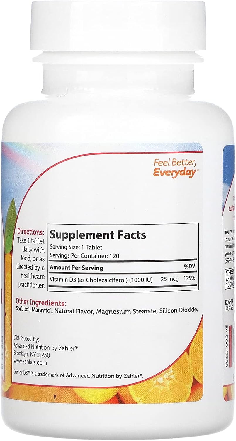 Zahler Junior D3 Vitamins 1000 Iu - Chewable Vitamin D3 For Kids - Vitamin D For Kids To Support Bone, Teeth & Immune Health - Kosher Kids Vitamin D3 Orange Flavor - D3 Vitamins For Kids 120 Count