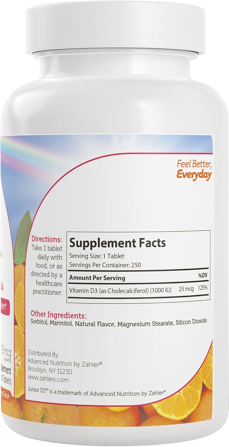 Zahler Junior D3 Vitamins 1000 Iu - Chewable Vitamin D3 For Kids - Vitamin D For Kids To Support Bone, Teeth & Immune Health - Kosher Kids Vitamin D3 Orange Flavor - D3 Vitamins For Kids 250 Count
