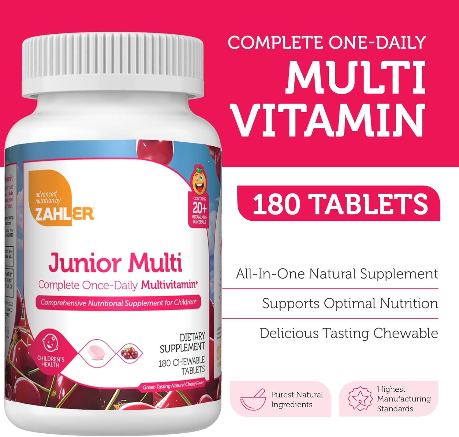 About this item COMPLETE NUTRITION - Your kids can experience all in one vitamin, mineral and micronutrient supplementation with these tasty and easy to chew multivitamins for children's health, wellness and growth. 20+ nutrients per serving. MINDS & BODIES - Our junior multi has over 20 vitamins and minerals to help support growth of the brain and body in children of all ages. For children 4 - 6 years old: take 1 tablet daily. For children 7 years and older: take 1 tablet twice daily. LESS SUGAR - Gummy vitamins are full of sugar and binding agents. Unlike multivitamin gummies, our easy to digest chewable tablets have a natural cherry flavor without all the sugar. Sugar can cause energy spikes and be bad for oral health and tooth enamel. IMMUNE SUPPORT - Each serving contains Vitamin C, Vitamin D3, Zinc and other immune support vitamins and minerals. We also fortify with iron, calcium and magnesium for strong healthy bones and muscles. MADE IN THE USA - Zahler makes our Junior Multi in our state of the art GMP Certified Facility. Each serving is certified Kosher and made from high quality ingredients right here in the USA. Non GMO, gluten free and dairy free.  See more product details,COMPLETE NUTRITION - Your kids can experience all in one vitamin, mineral and micronutrient supplementation with these tasty and easy to chew multivitamins for children's health, wellness and growth. 20+ nutrients per serving,MINDS & BODIES - Our junior multi has over 20 vitamins and minerals to help support growth of the brain and body in children of all ages. For children 4 - 6 years old: take 1 tablet daily. For children 7 years and older: take 1 tablet twice daily,LESS SUGAR - Gummy vitamins are full of sugar and binding agents. Unlike multivitamin gummies, our easy to digest chewable tablets have a natural cherry flavor without all the sugar. Sugar can cause energy spikes and be bad for oral health and tooth enamel,IMMUNE SUPPORT - Each serving contains Vitamin C, Vitamin D3, Zinc and other immune support vitamins and minerals. We also fortify with iron, calcium and magnesium for strong healthy bones and muscles,MADE IN THE USA - Zahler makes our Junior Multi in our state of the art GMP Certified Facility. Each serving is certified Kosher and made from high quality ingredients right here in the USA. Non GMO, gluten free and dairy free