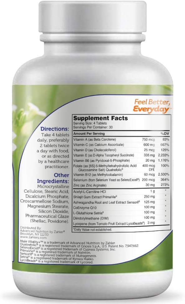 Zahler Male Vitality+, Male Fertility Supplements, Male Formula Supporting Energy and Reproductive Wellness, Certified Kosher, 120 Tablets