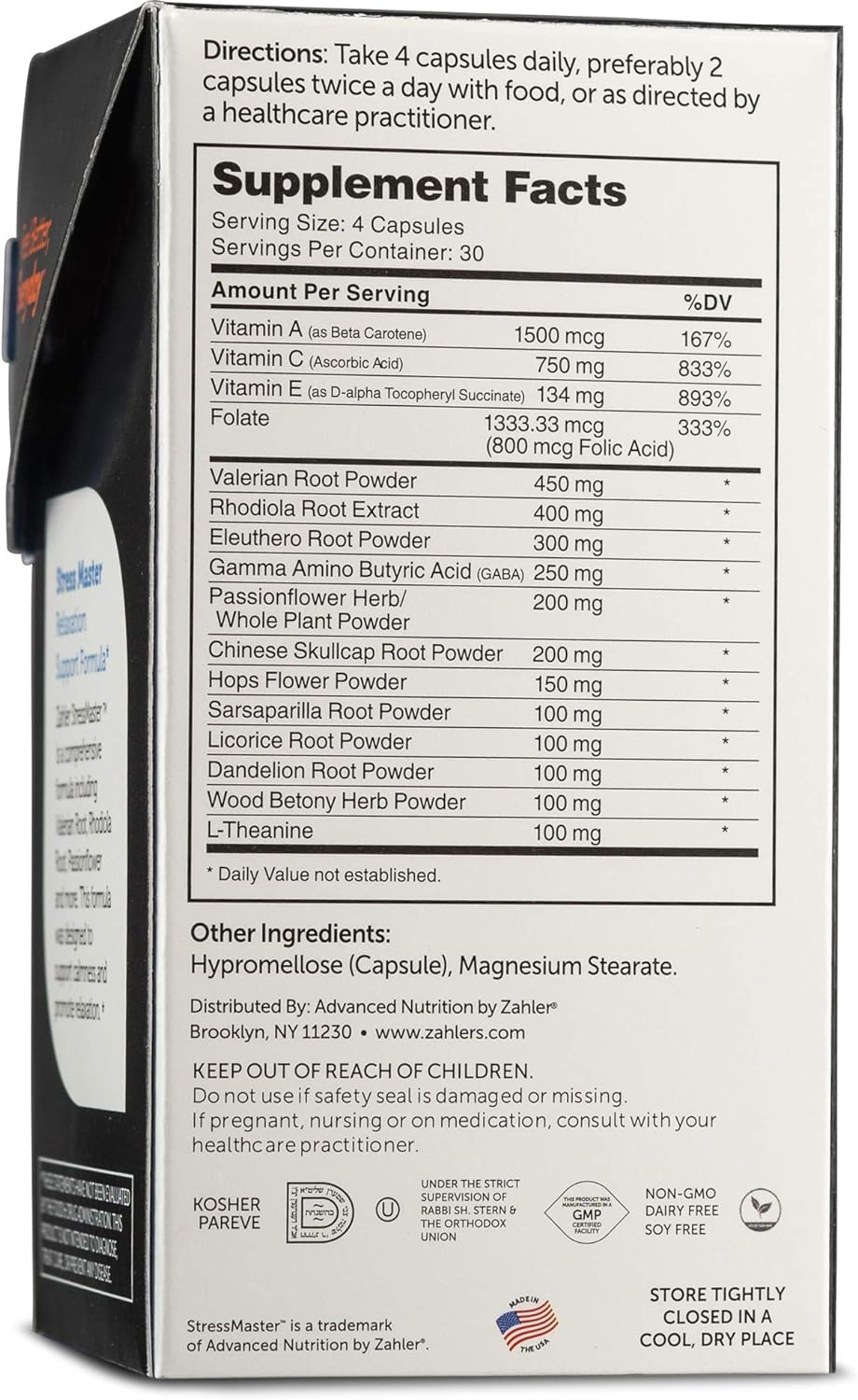 DESCRIPTION : Zahler StressMaster, Relaxation Support Supplement, Promotes Natural Calm, Certified Kosher 120 Capsules