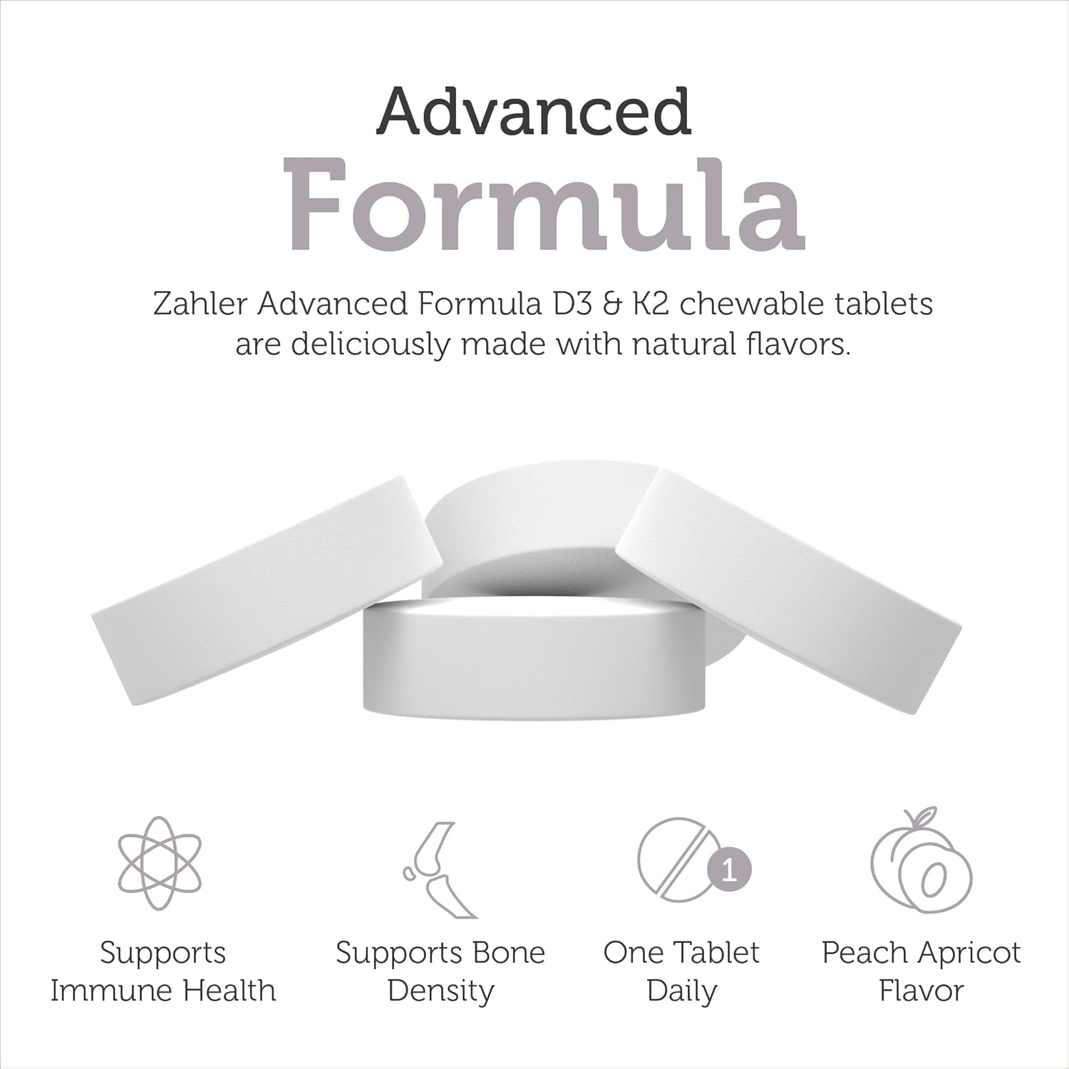 About this item VITAMIN D & K - Vitamin K2 and D3 work together to support bone density in adult women and men. Essential vitamin K2 & D3 play an important role in calcium absorption in our bones and teeth and support immune health. Vit D3 5000 IU per serving, 120 mcg of K2 Vitamin. BETTER TOGETHER - Vitamin K helps maximize Vitamin D3's benefits. Vit D3 & K2 work in tandem to help bone and dental tissue absorb calcium and support bone density. These fat soluble vitamins support cardiovascular and immune health in adults of all ages. DELICIOUS PEACH APRICOT - Each chewable tablet has a great tasting peach apricot flavor. Take 1 chewable tablet daily with food, or as directed by a healthcare practitioner. CERTIFIED KOSHER - Servings of Zahler Advanced D3 & K2 Formula are Certified Kosher and vegetarian friendly. Each serving is free of dairy, soy and gluten. Product contains natural flavors. MADE IN THE USA - Zahler uses state of the art GMP certified facilities to help ensure potency and purity of all our dietary supplements. This product is Non GMO and Certified Kosher with pure, unadulterated ingredients sourced from nature.  See more product details,VITAMIN D & K - Vitamin K2 and D3 work together to support bone density in adult women and men. Essential vitamin K2 & D3 play an important role in calcium absorption in our bones and teeth and support immune health. Vit D3 5000 IU per serving, 120 mcg of K2 Vitamin,BETTER TOGETHER - Vitamin K helps maximize Vitamin D3's benefits. Vit D3 & K2 work in tandem to help bone and dental tissue absorb calcium and support bone density. These fat soluble vitamins support cardiovascular and immune health in adults of all ages,DELICIOUS PEACH APRICOT - Each chewable tablet has a great tasting peach apricot flavor. Take 1 chewable tablet daily with food, or as directed by a healthcare practitioner,CERTIFIED KOSHER - Servings of Zahler Advanced D3 & K2 Formula are Certified Kosher and vegetarian friendly. Each serving is free of dairy, soy and gluten. Product contains natural flavors,MADE IN THE USA - Zahler uses state of the art GMP certified facilities to help ensure potency and purity of all our dietary supplements. This product is Non GMO and Certified Kosher with pure, unadulterated ingredients sourced from nature