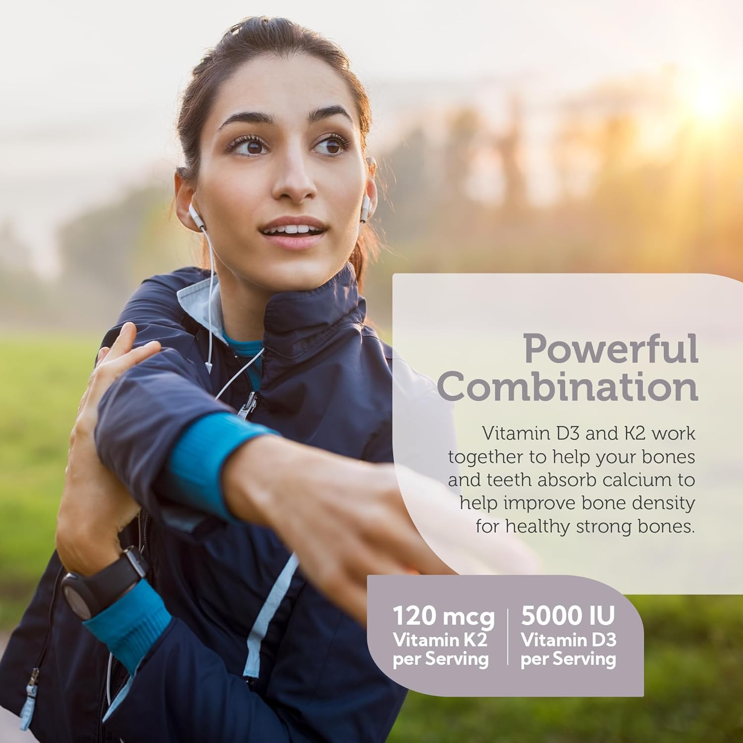 VITAMIN D & K - Vitamin K2 and D3 work together to support bone density in adult women and men. Essential vitamin K2 & D3 play an important role in calcium absorption in our bones and teeth and support immune health. Vit D3 5000 IU per serving, 120 mcg of K2 Vitamin