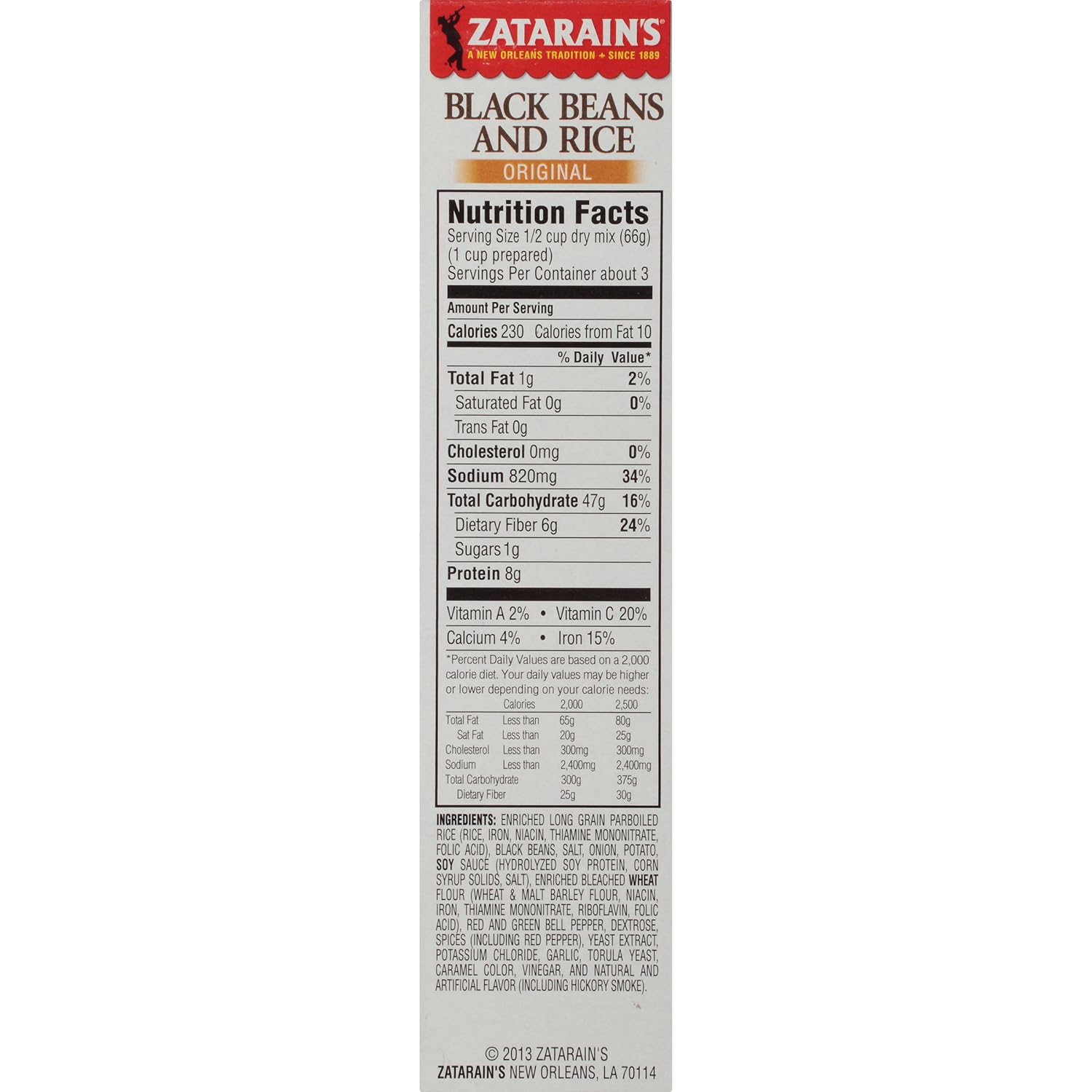 Product Description No single culture owns beans and rice. Itās a natural pairing that likely developed independently in different parts of the world. Our Black Beans & Rice is rooted in the Caribbean, where the combination of savory black beans and fluffy rice is a daily staple. Zatarainās Black Beans & Rice is flavorful but not spicy and goes great with a variety of meats, but is hearty enough to stand alone as a meatless entrĆ©e. This comes with precooked beans and is ready in less than 30 minutes. About the Brand A label from the earlier days of Zatarain's The tradition for making Zatarain's amazing New Orleans-style products was started well before the turn of the century by a man named Emile A. Zatarain, Sr. In 1889, he obtained the company's first product trademark and started to market root beer. Shortly after, he began to produce mustards, pickled vegetables, and extracts. As the business grew, so did the demand for a broader range of products. Through their expertise in blending spices, the company established a reputation for making only the most authentic New Orleans-Style food. In 1963, the Zatarain family sold the business, which was then moved to Gretna, Louisiana, a suburb of New Orleans. Today, Zatarain's is the nation's leading maker of New Orleans-style food products. Zatarain's prides itself on great taste, high quality, and a near fanatical dedication to New Orleans cuisine. Interestingly, Zatarain's is as much a tradition at backyard barbecues as it is at formal dinners. From its humble beginnings, the company has grown to make more than 200 food products from rice dinner mixes, pasta dinner mixes, breadings, seasonings, and spices to seafood boils, stuffing mixes, and other products based on authentic New Orleans-style foods and seafood preparation