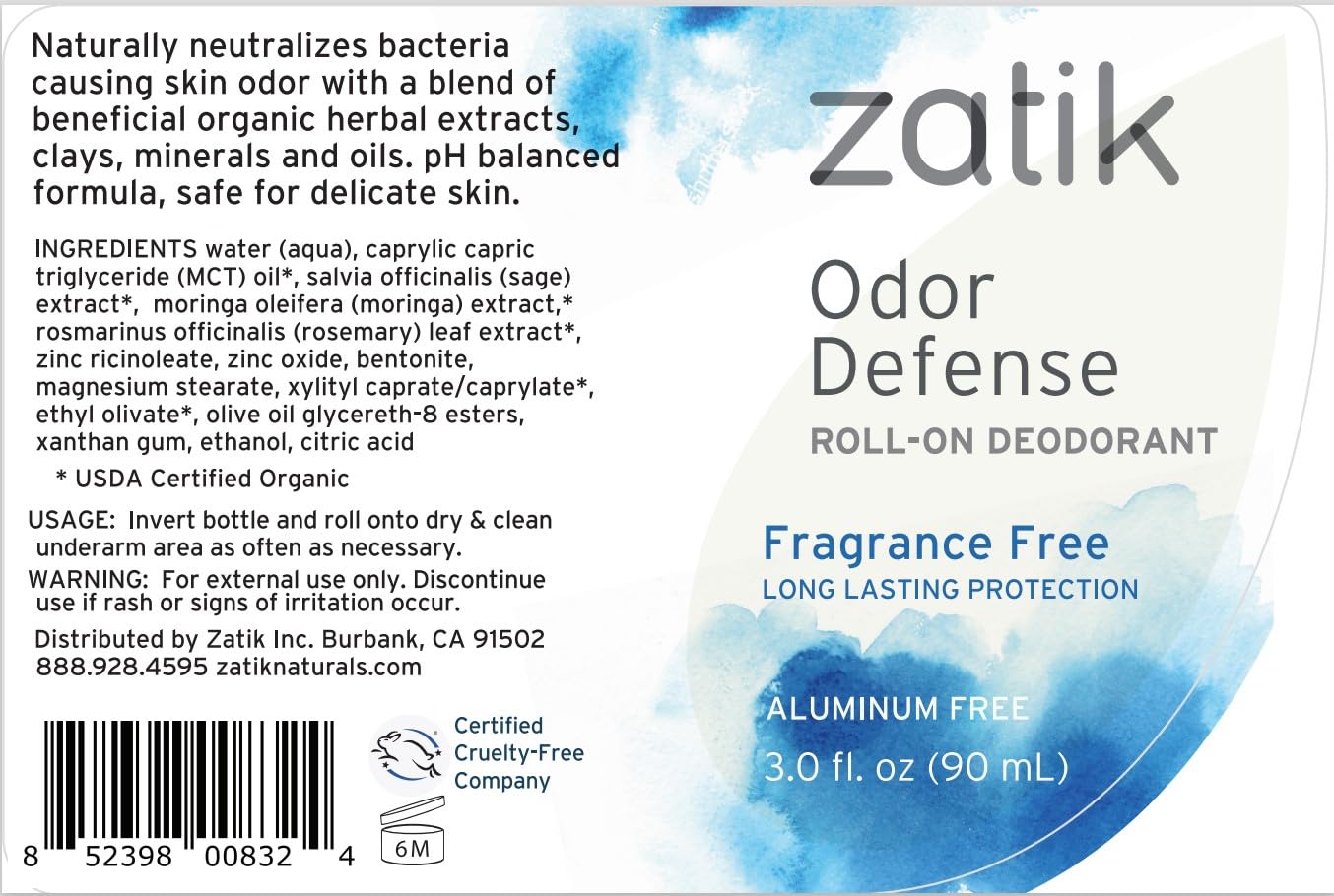 Zatik Naturals - Odor Defense Deodorant Roll On, Unscented Herbal Refresh, Cruelty Free Vegan, Ph Balanced, Bio-Degradable Free From Aluminum Parabens Non Toxic, 3.0 Fl Oz, 90Ml