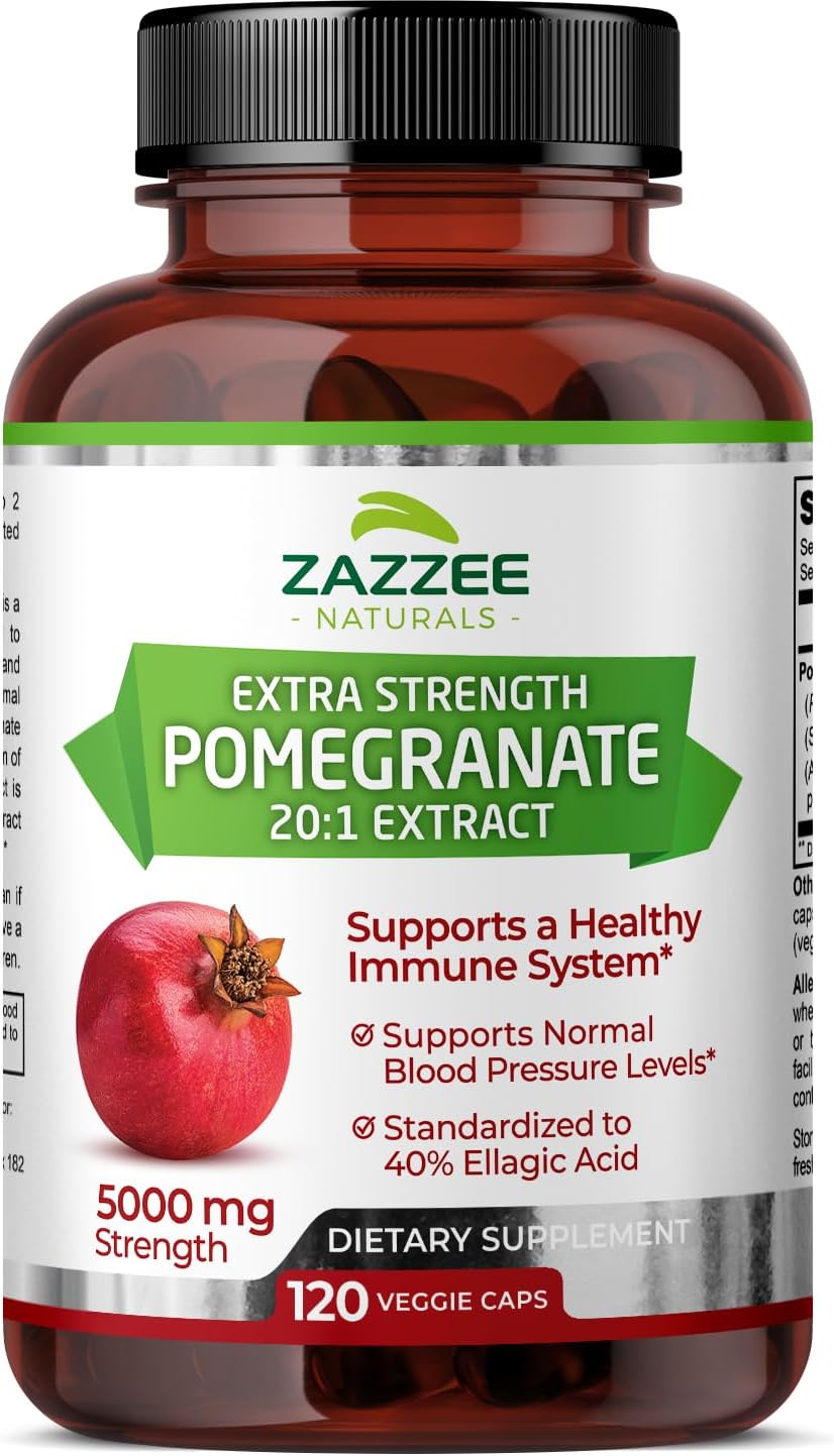 DESCRIPTION : Zazzee Extra Strength Pomegranate 20:1 Extract, 5000 mg Strength, 40% Ellagic Acid, 120 Vegan Capsules, 4 Month Supply, Standardized, Concentrated 20X Extract, 100% Vegetarian, All-Natural and Non-GMO