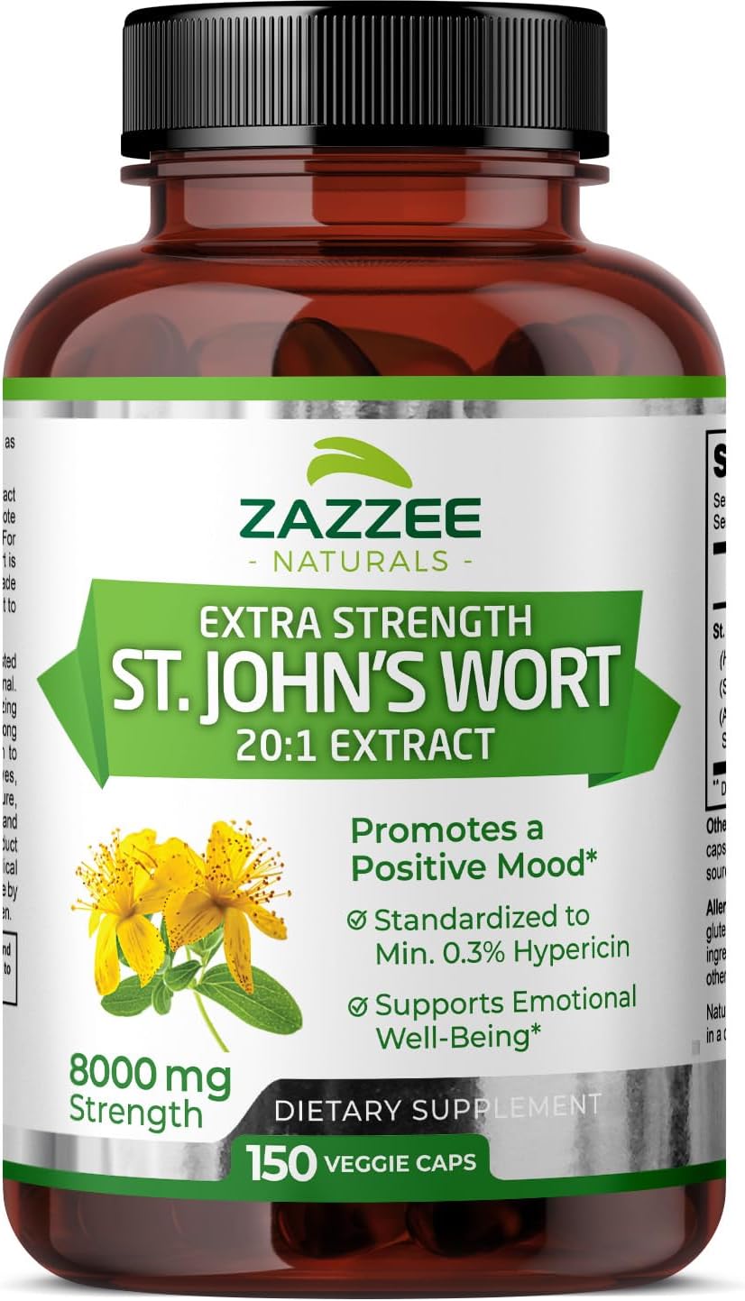 Zazzee Extra Strength St. John’S Wort 20:1 Extract, 8000 Mg Strength, 0.3% Hypericin, 150 Vegan Capsules, 5 Month Supply, Concentrated, Standardized 20X Extract, 100% Vegetarian, Non-Gmo, All-Natural