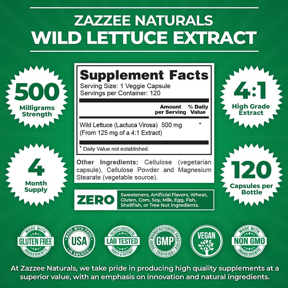 Zazzee Extra Strength Wild Lettuce 4:1 Extract, 500 Mg Strength, 120 Vegan Capsules, Potent Lactuca Virosa Variety, Standardized And Concentrated 4X Extract, 100% Vegetarian, All-Natural And Non-Gmo