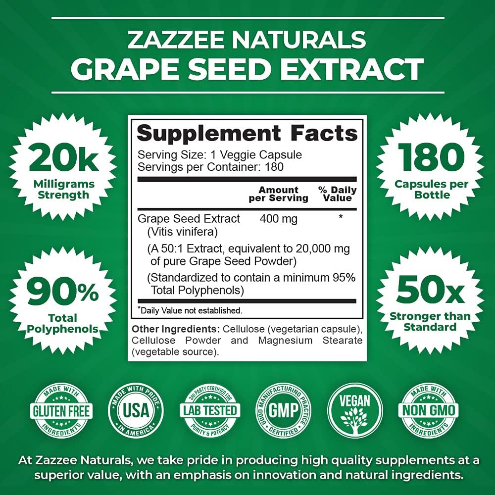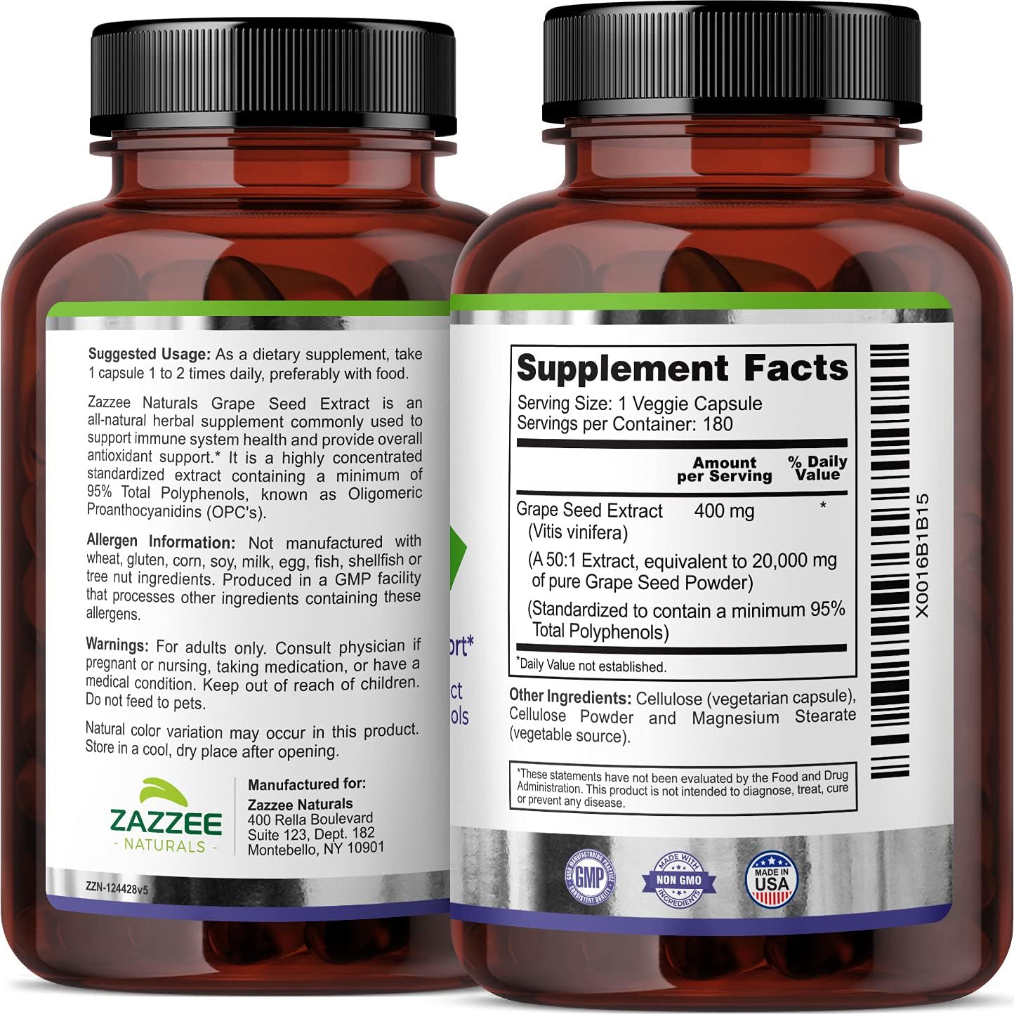 Get these 2 Zazzee Products - at an incredible price! GRAPE SEED EXTRACT:  Some of the many benefits of Zazzee Naturals Grape Seed Extract include: Contains 20,000 mg strength per capsule Contains 180 capsules per bottle Derived from a potent, powerful 50:1 extract Contains 400 mg per capsule Minimum 95% Polyphenols A superior value (be sure to compare against actual dosages, extract ratio, and servings in competitor products) 100% vegan, non-GMO, and allergen-free Enjoy the benefits of high potency Grape Seed Extract - at a very affordable price! ADVANCED IMMUNE SUPPORT:  Some of the many benefits of Zazzee Naturals Advanced Immune Support include: A powerful 5-in-1 complex Contains 1300 mg strength per tablet Contains 1000 mg of Vitamin C per tablet Contains a 30 day supply Only 1 tablet per serving Contains potent, concentrated extracts An amazing value (be sure to compare against actual dosages, concentrates, and servings in competitor products) 100% vegan, non-GMO, and allergen-free Enjoy the benefits of our high potency, concentrated, pharmaceutical grade Grape Seed Extract Capsules and Advanced Immune Support tablets - at a very affordable price!