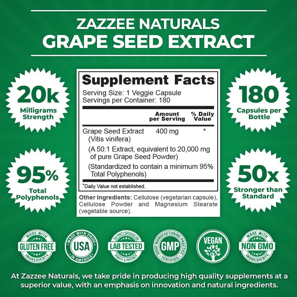 Zazzee High Strength Grape Seed 50:1 Extract, 20,000 Mg Strength, 180 Vegan Capsules, 95% Polyphenols, 6 Month Supply, Concentrated, Standardized 50X Extract, 400 Mg Per Capsule, All-Natural, Non-Gmo