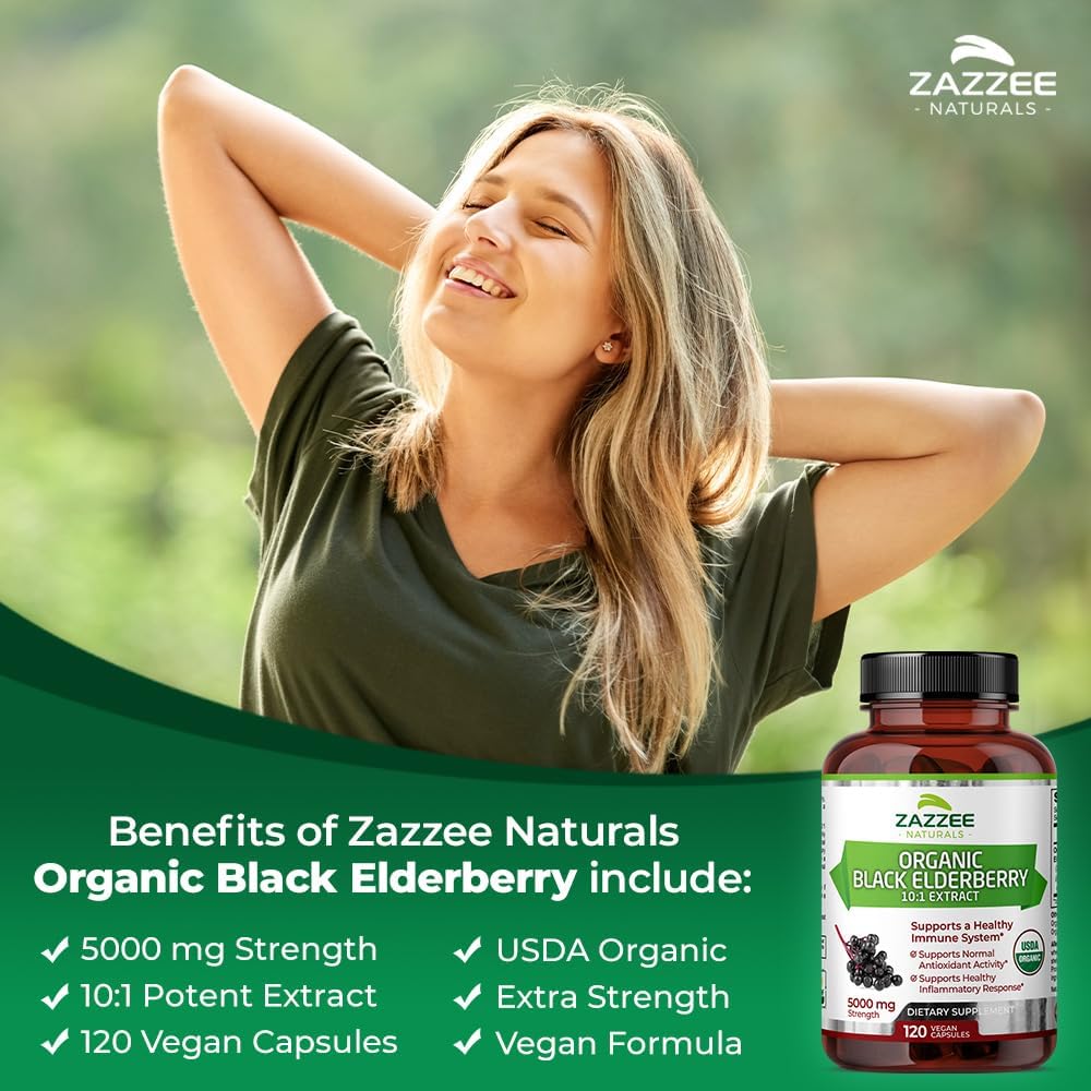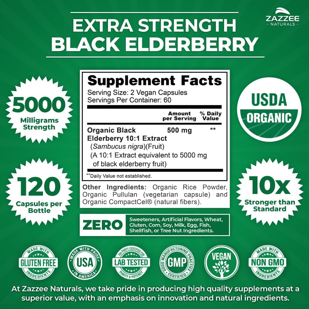 Zazzee Usda Organic Black Elderberry 10:1 Extract, 5000 Mg Strength, 120 Vegan Capsules, 2 Month Supply, Standardized, Concentrated 10X Extract, 100% Vegetarian, All-Natural, Non-Gmo, Made In The Usa