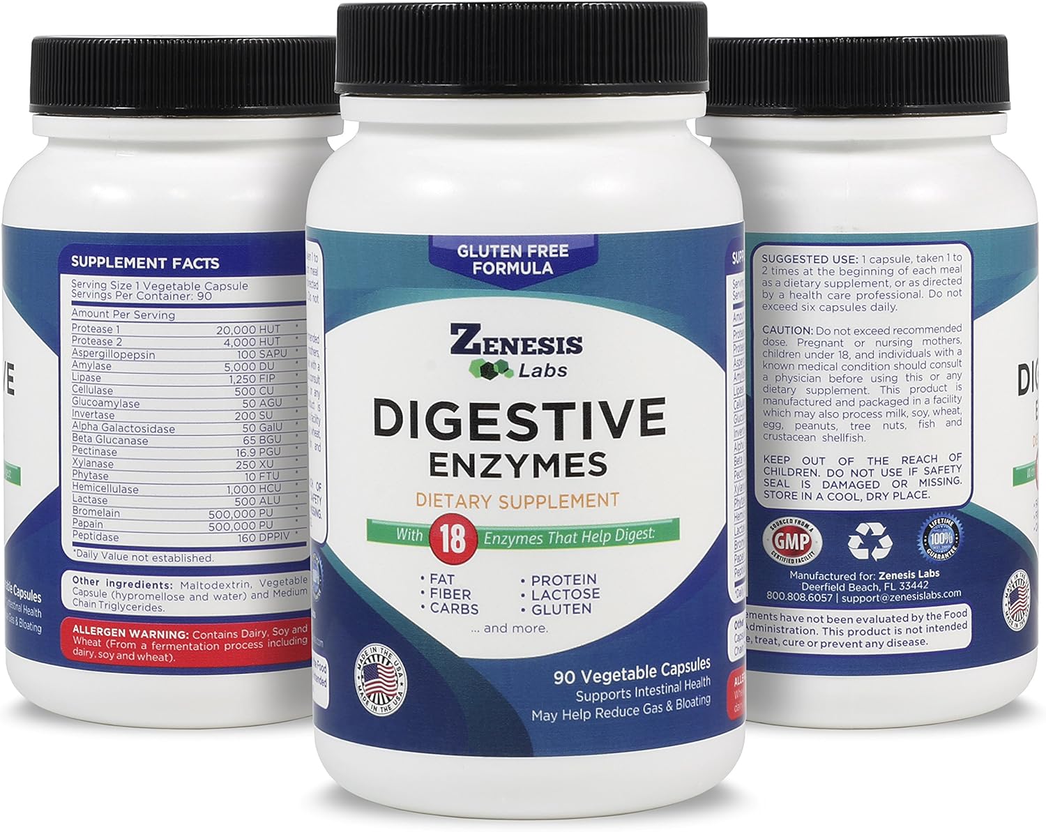 Zenesis Labs Digestive Enzymes - With Amylase, Bromelain, Protease, Lipase, & 14 Other Enzymes - 90 Capsules