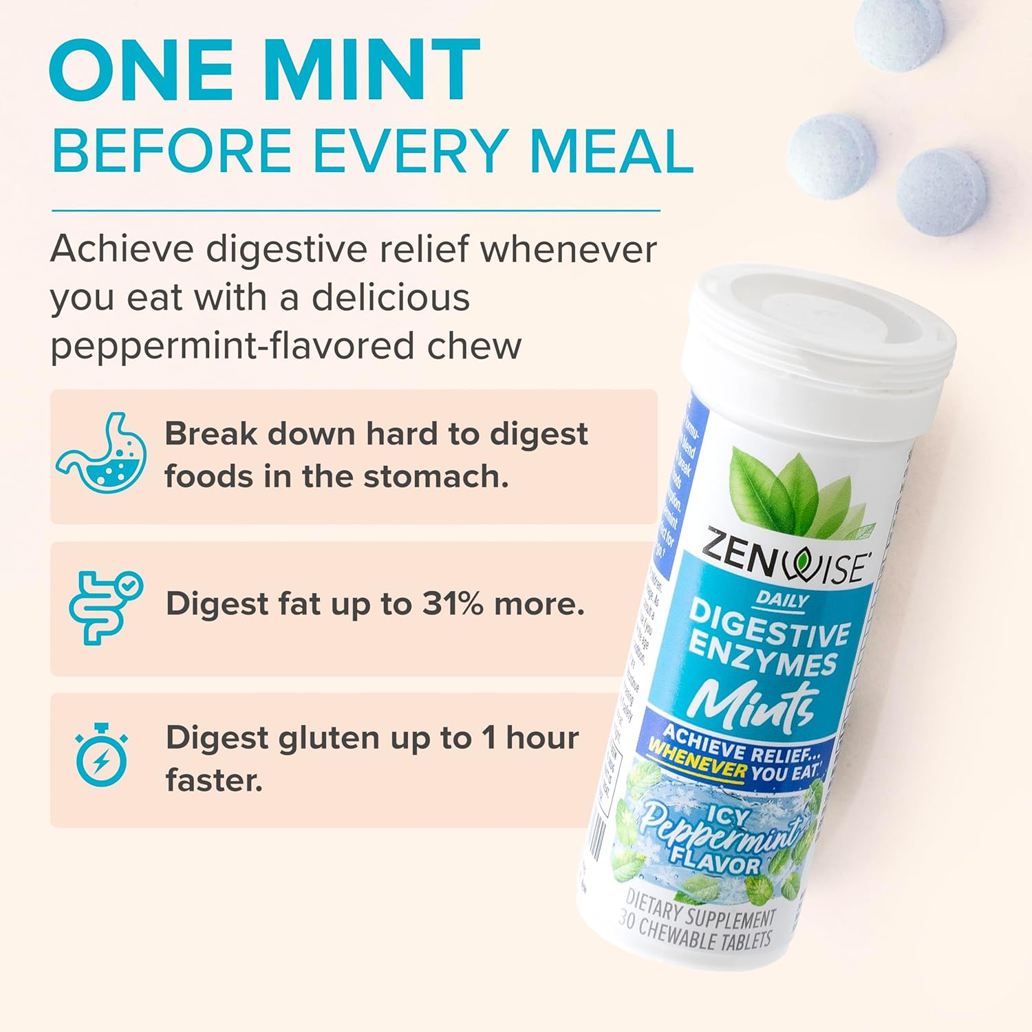 30 SERVING SUPPLY: Includes 1 (30 Count) Zenwise Digestive Enzymes Mints Peppermint Flavor. We suggest 1 mint pre-meal