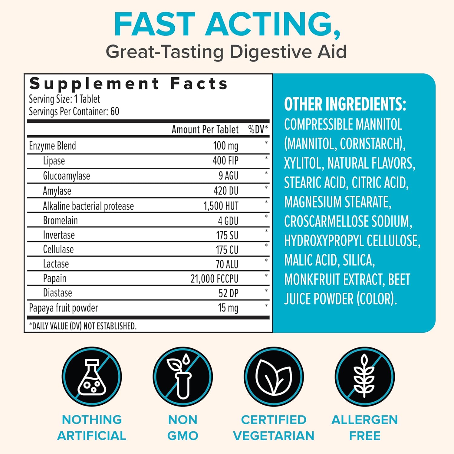 Digestion Relief + Nutrient Absorption: Features papaya powder andan enzyme blend proven to break down hard-to-digest foods, including fats, proteins, carbs, and gluten