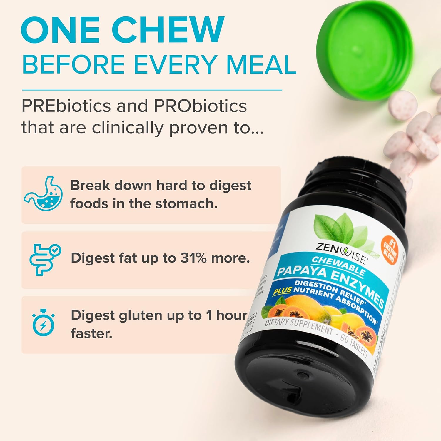 Zenwise Health Papaya Enzymes Chewable With Digestive Enzymes And Bromelain For Digestive Health And Bloating Relief For Women And Men, Enzymes For Digestion And Gut Health - 60 Ct
