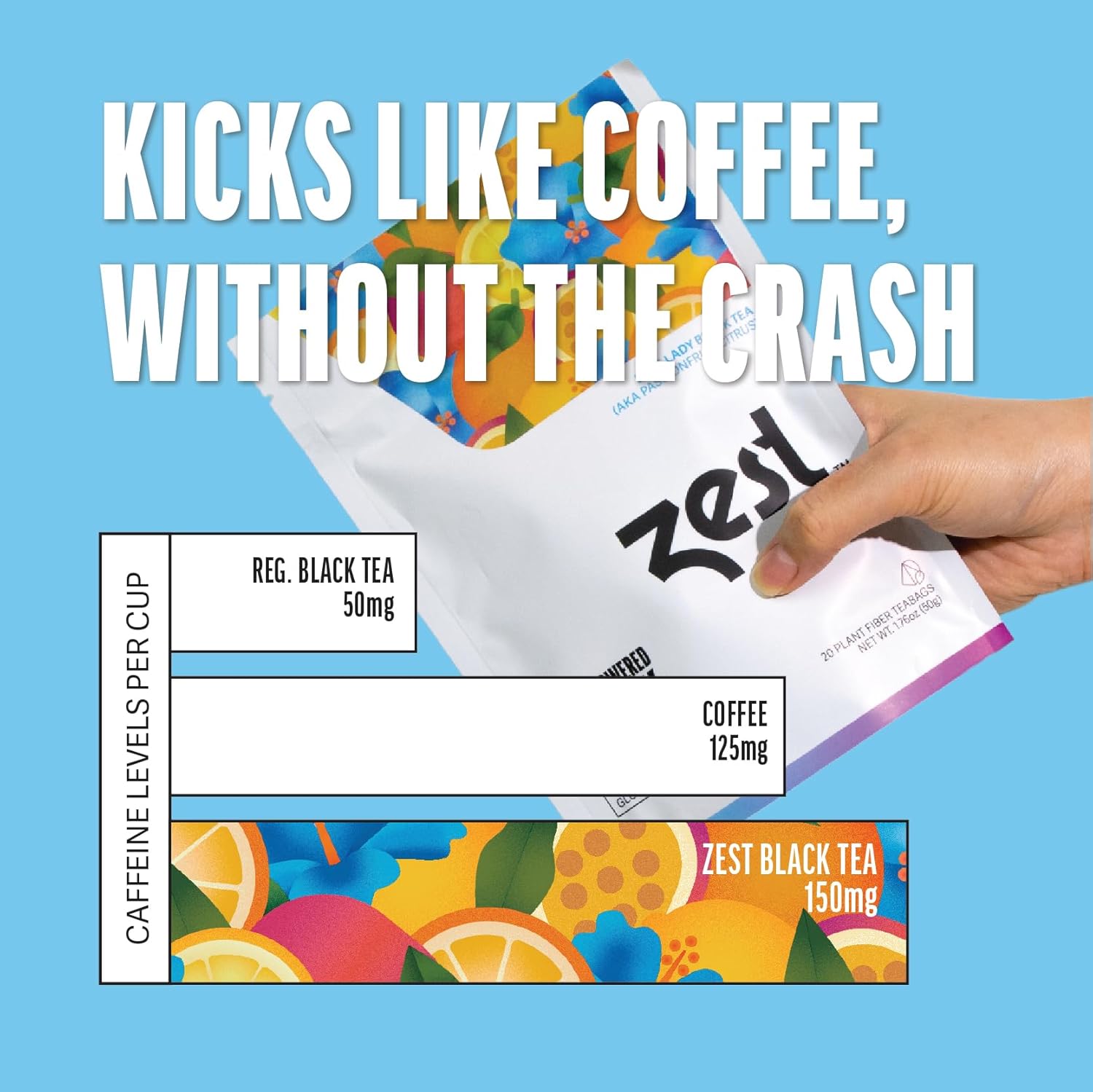 150Mg Caffeine Per Cup: Our Strong Black Fruit Hot Tea Has More Caffeine Than Coffee; 3X The Energy Levels Of Traditional Caffeinated Black Teas. This Makes Zest The Strongest Tea On The Market, And Is The Perfect High Energy Pick Me Up For Your Morning Or Mid-Day Slump