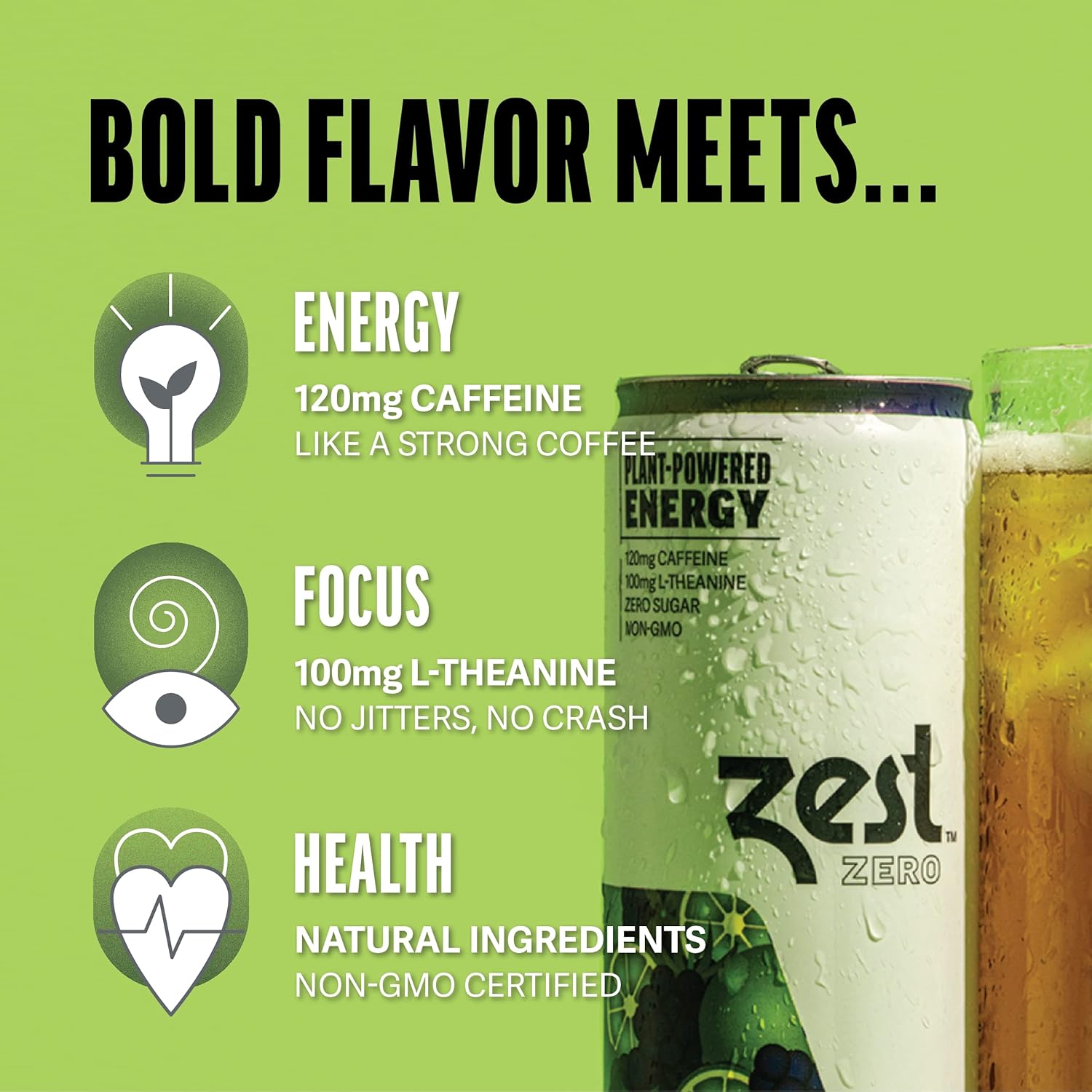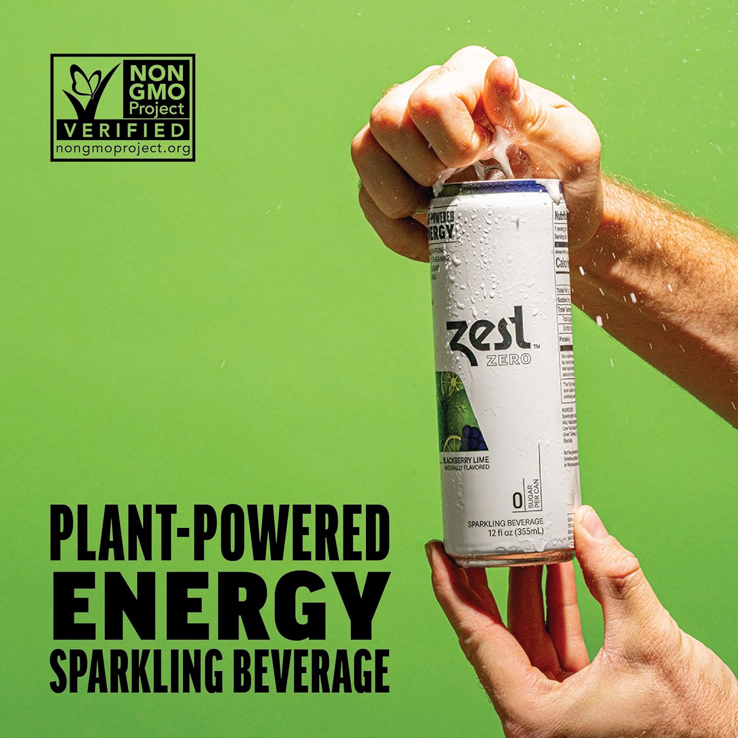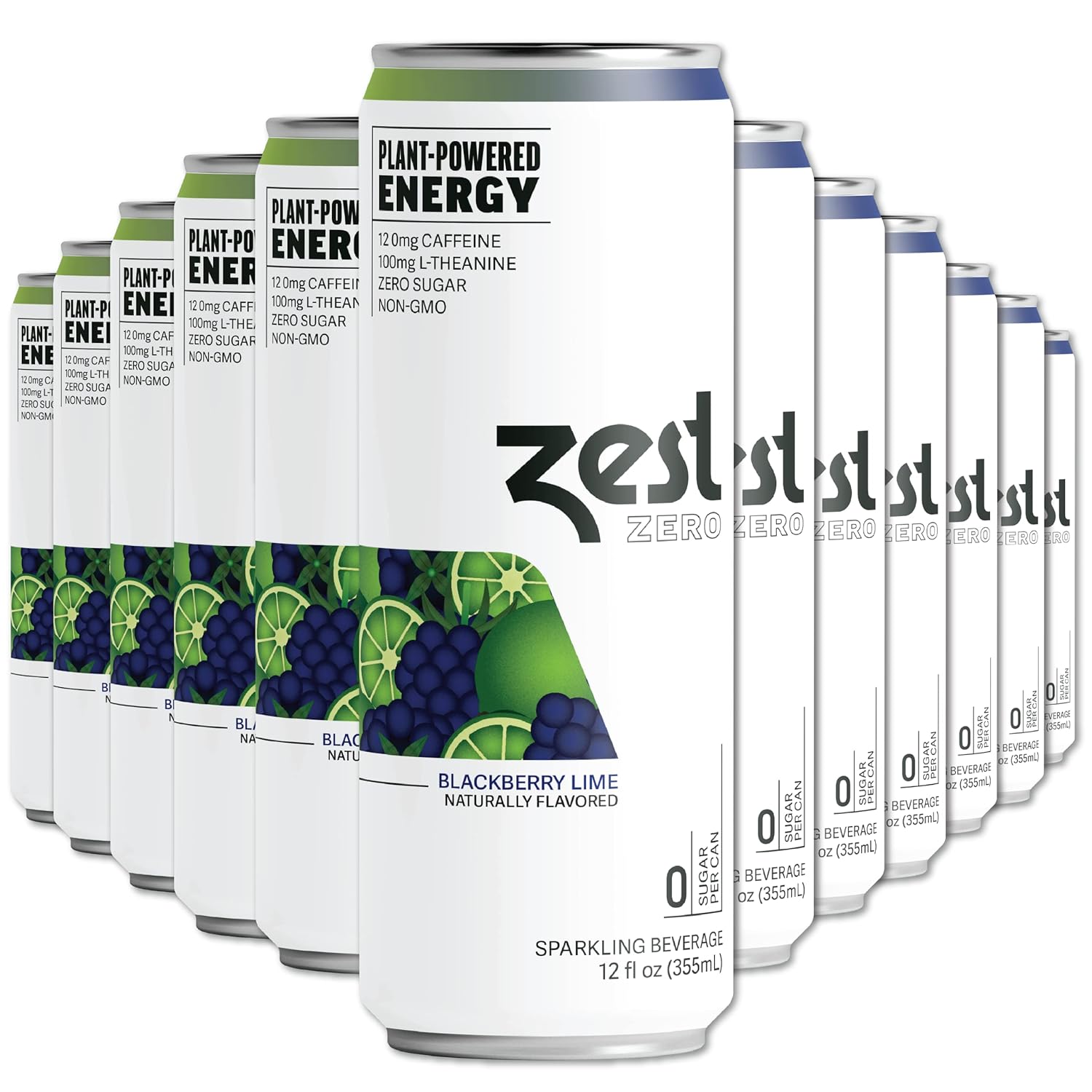 Zest Plant Powered Natural Energy Sparkling Drink - Blackberry Lime - Caffeine + L-Theanine - 12Oz Can, 12 Pack - Zero Sugar, 0 Calories, Whole 30, Healthy Coffee Substitute, Non Gmo High Caff Blend