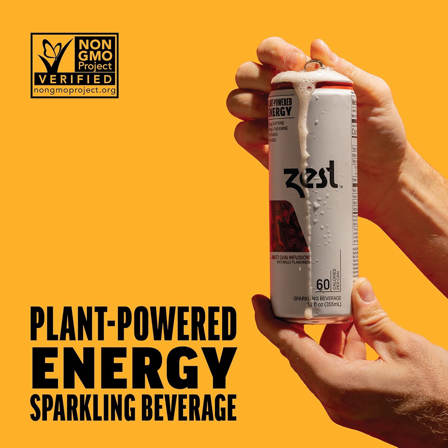 Zest Plant Powered Natural Energy Sparkling Drink - Sweet Chai Infusion - 150Mg Caffeine + 100 Mg L-Theanine - 12Oz Can 12 Pack - Low Sugar, 60 Cals, Healthy Coffee Substitute, Non Gmo High Caff Blend