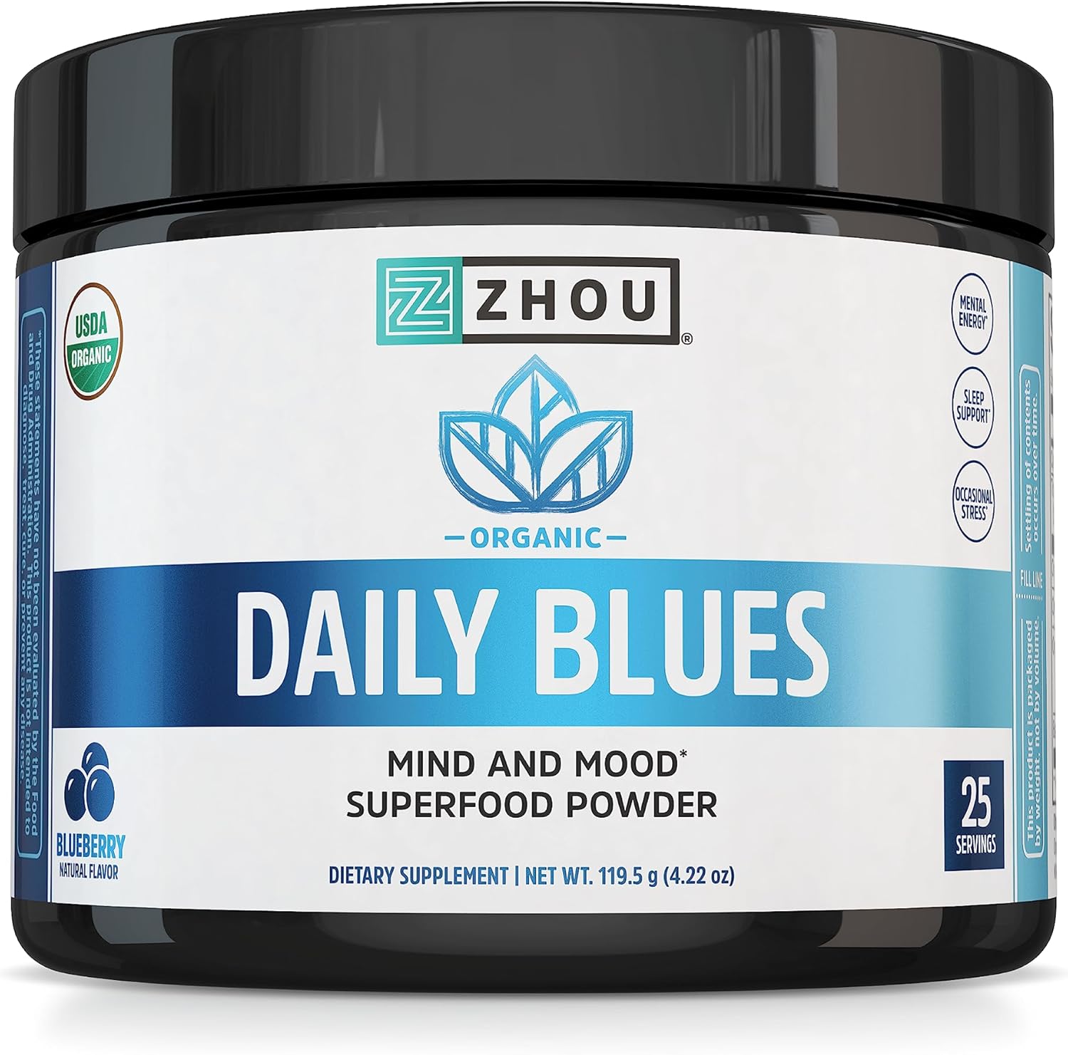 Zhou Nutrition Usda Organic Blue Spirulina Powder With Ksm-66 Ashwagandha And Blueberry, Organic Superfood Powder, Antioxidants, Fiber, Mental Energy, Sleep, Digestion, Non-Gmo, Vegan, 25 Servings