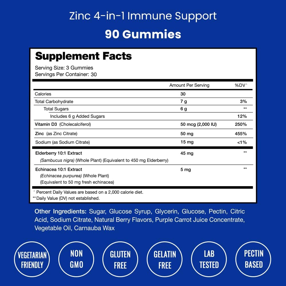 DESCRIPTION : Zinc Gummies | 4-in-1 Zinc Gummies Adult | Zinc Chewable 50mg | Chewable Zinc Supplement Gummies with Vitamin D3 2000 IU, Elderberry & Echinacea | Immune, Heart & Brain Support | 180 Count (2 Pack)