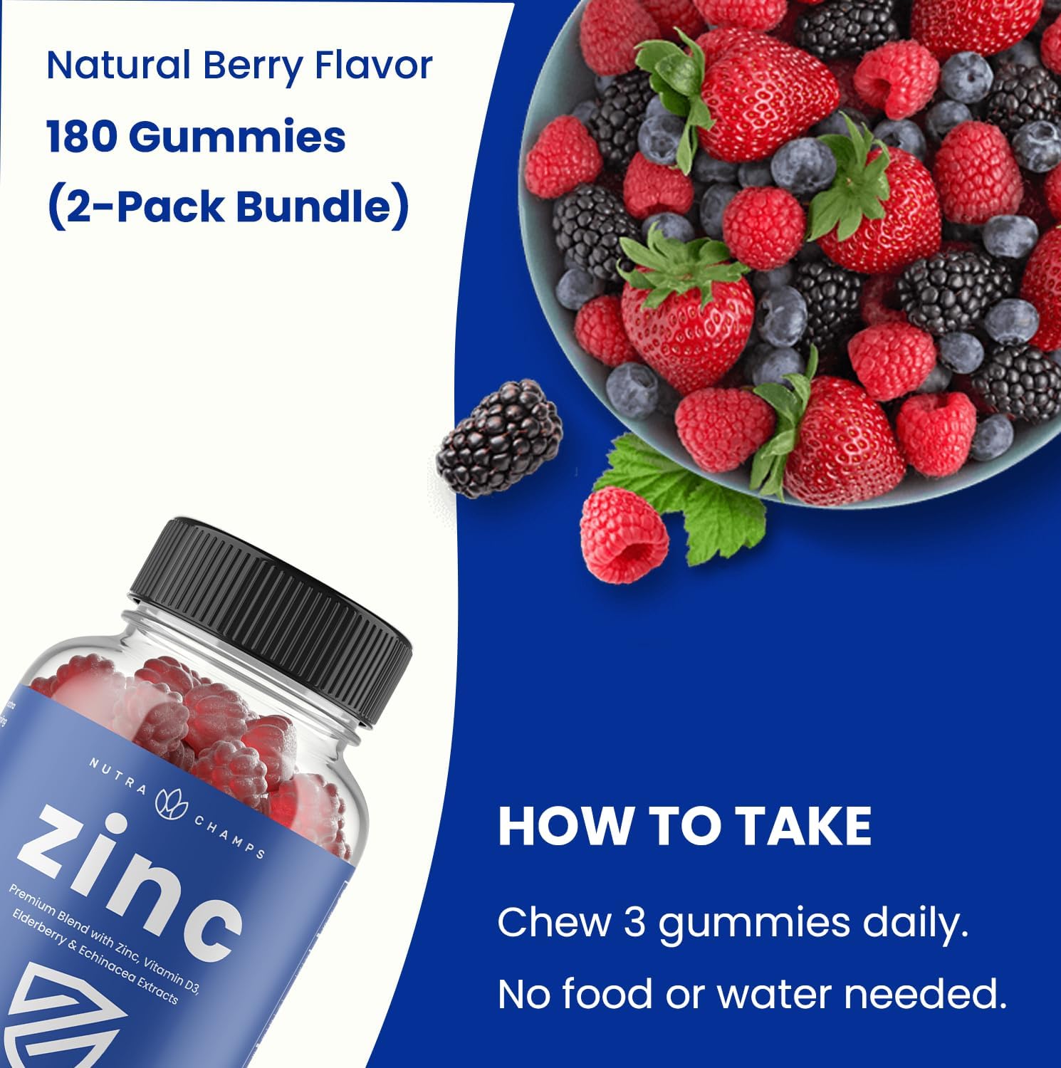 3 >Natural Berry Flavor - Our tasty zinc gummies are both delicious & nutritious, & help keep your immune system in great shape. Delivering an extra strength 50mg of zinc per serving, your body's natural defenses can enjoy a hefty immune boost