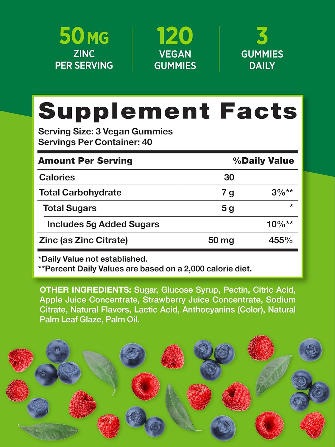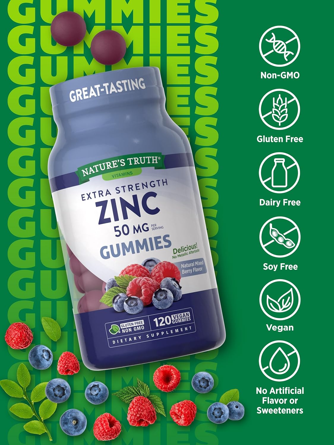 What Is Zinc Zinc Is An Essential Mineral That The Body Needs But Cannot Make On Its Own. Known For Its Wide Range Of Benefits, Zinc Can Be Obtained From Certain Foods Such As Meat, Nuts, Seeds, And Dairy ā But It Can Be Difficult To Receive The Recommended Daily Amount Through Diet Alone. Choosing To Take A Zinc Supplement Is A Wonderful Way To Fulfill Your Daily Requirement. NatureāS Truth Zinc Gummies Each Serving Of Our Zinc Gummies Delivers 50 Mg Of Zinc (As Zinc Citrate), Which Meets The Daily Recommended Value Of This Important Mineral. Our Extra Strength Gummy Formula Is Vegan Friendly And A Delicious Mixed Berry Flavor With No Metallic Aftertaste. Gummies Are A Wonderful Alternative For Those Who Dislike Or Have Trouble Swallowing Pills And Can Easily Be Integrated Into Your Daily Routine. NatureāS Truth: Where Wellness Begins Our Mission At NatureāS Truth Is To Meet Your Wellness Needs With Products That Go Above And Beyond. NatureāS Truth Provides Supplements In Various Delivery Forms, Such As Capsules, Softgels, Chewables, Tablets, Powders, Liquids, And Gummies To Suit Every Preference. Our Zinc Is Vegan, Non-Gmo And Free Of Gluten, Wheat, Yeast, Milk, Lactose, Soy, And Artificial Sweetener