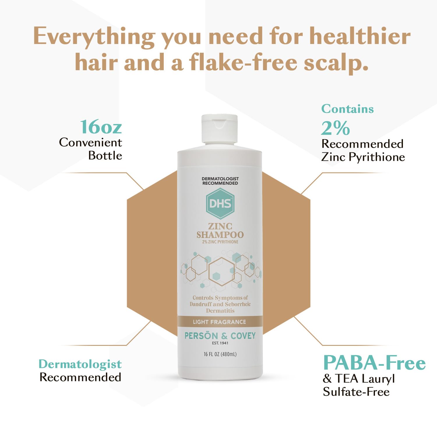 About this item Dermatologist recommended for fast-acting relief from dandruff and seborrheic dermatitis flare-ups. Gentle and clean on your scalp and hair. Generous 16 oz bottle. Soothing nourishing formula contains 2% Zinc Pyrithione. PABA free. TEA Lauryl Sulfate-free. No seal when in new condition. Get instant relief starting with the first use. This calming unique formula is easy on your scalp and hair. Enjoy soft shiny hair with no more flakes. Wash your hair with DHS Zinc Shampoo 3-4 times a week, or as directed by your doctor. Use with DHS Regular or Clear Shampoo on the other days so your hair stays healthy. For three generations, Pers?n & Covey, Inc. has made quality products with the finest innovations in dermatological care and sun guard. Family-owned since 1941. Based in California, USA. › See more product details,Dermatologist recommended for fast-acting relief from dandruff and seborrheic dermatitis flare-ups. Gentle and clean on your scalp and hair,Generous 16 oz bottle. Soothing nourishing formula contains 2% Zinc Pyrithione. PABA free. TEA Lauryl Sulfate-free. No seal when in new condition,Get instant relief starting with the first use. This calming unique formula is easy on your scalp and hair. Enjoy soft shiny hair with no more flakes,Wash your hair with DHS Zinc Shampoo 3-4 times a week, or as directed by your doctor. Use with DHS Regular or Clear Shampoo on the other days so your hair stays healthy,For three generations, Pers?n & Covey, Inc. has made quality products with the finest innovations in dermatological care and sun guard. Family-owned since 1941. Based in California, USA