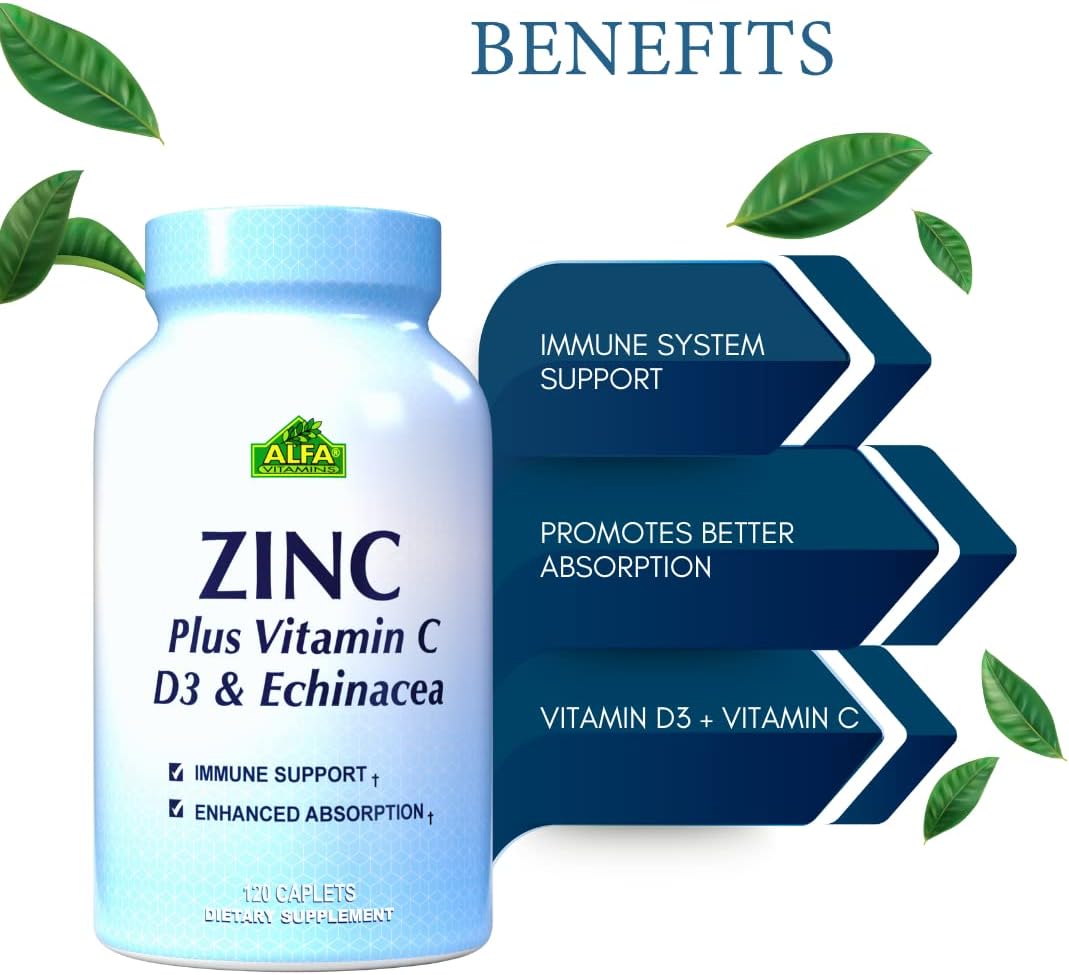 Zinc + Vitamin C, D & Echinacea Powerful Formula - Immune Support - Enhanced Absorption - 120 Caplets
