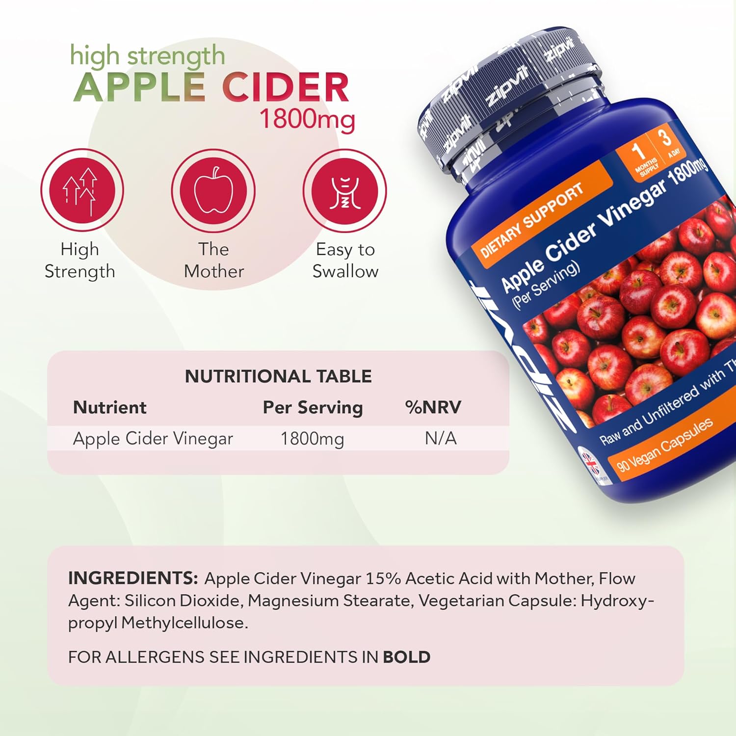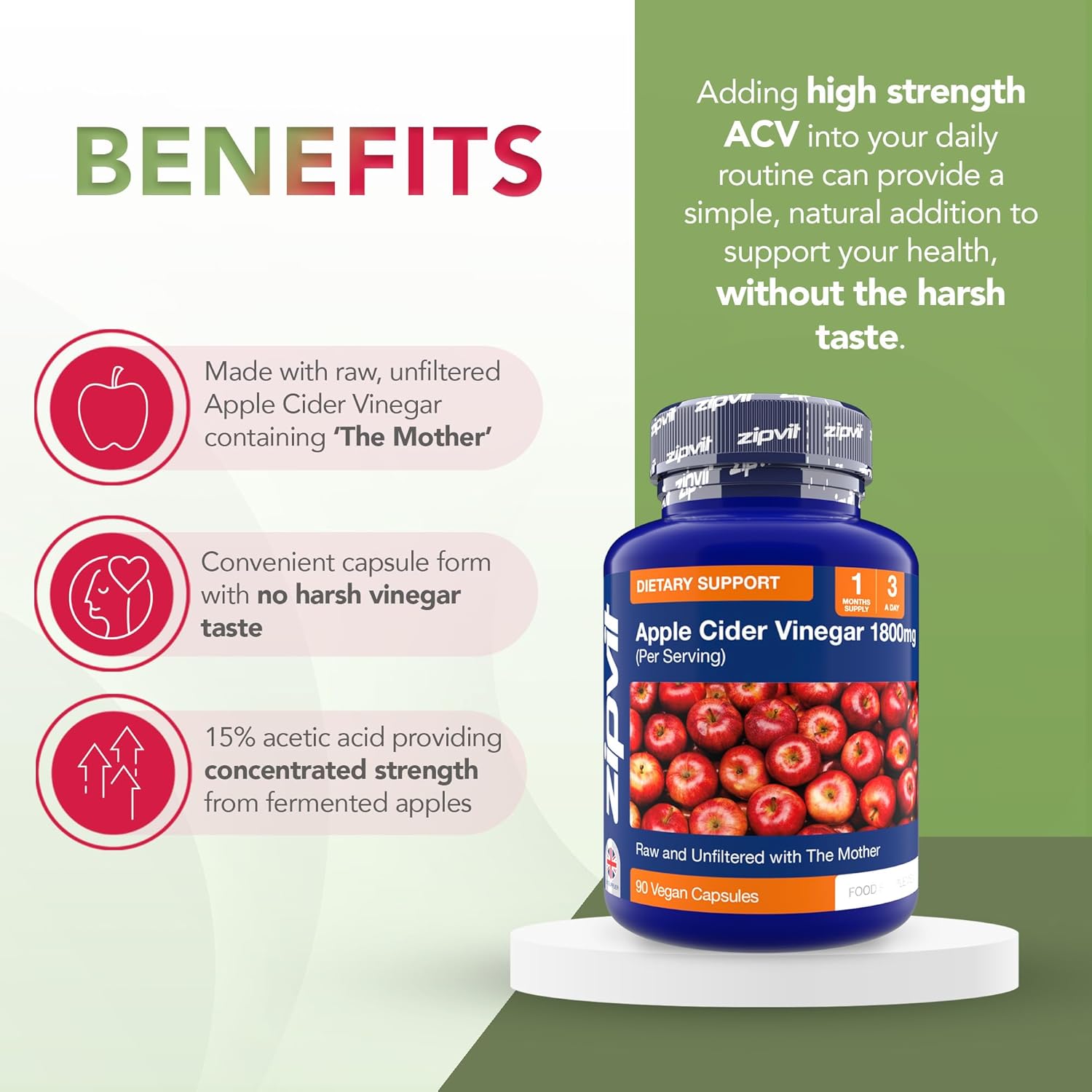 Zipvit Apple Cider Vinegar With Mother 1800Mg, 90 Vegan Capsules, Raw & Unfiltered Acv, High Strength, No Aftertaste