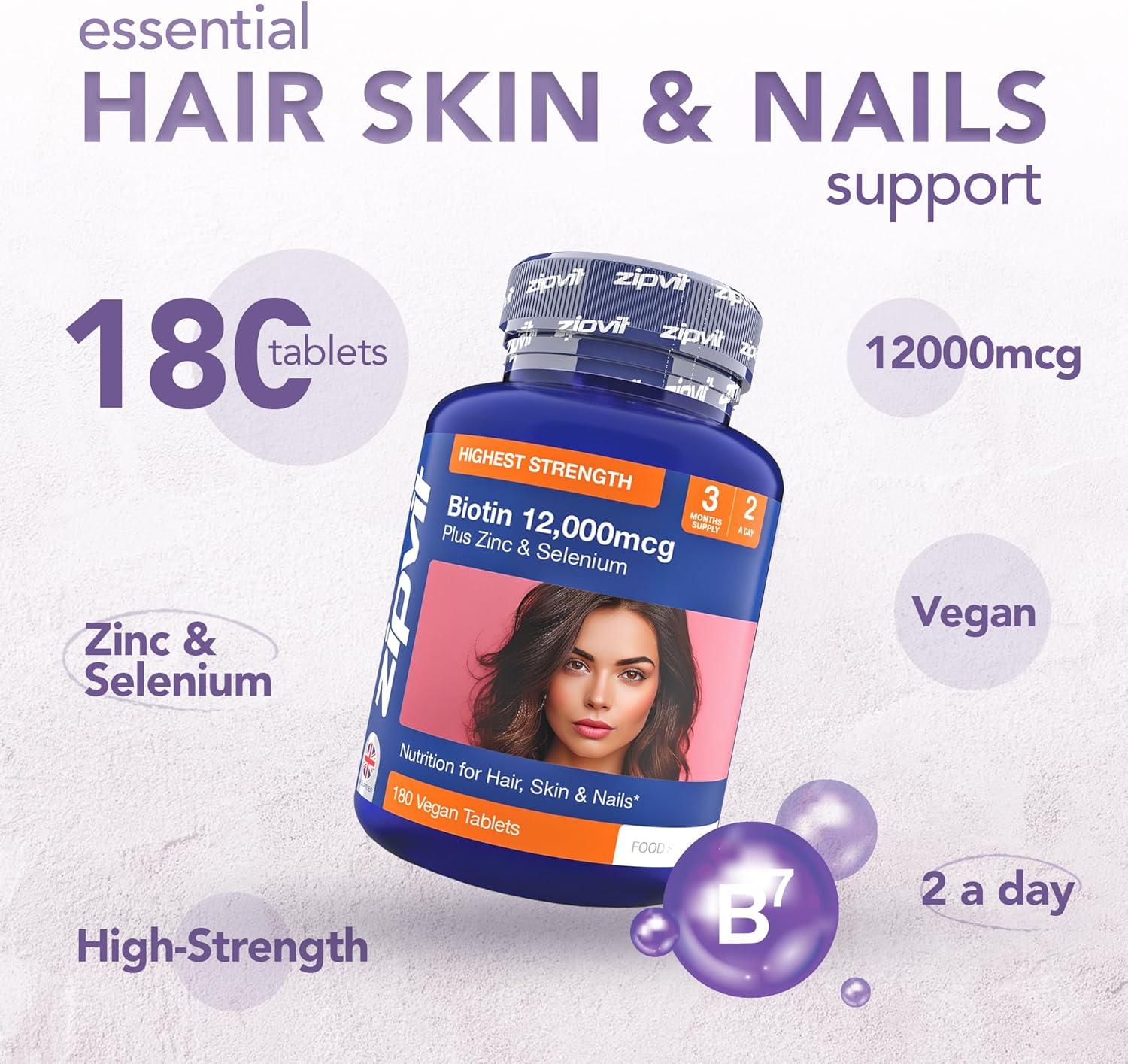 Zipvit Biotin Hair Growth Supplement 12000Mcg, Enriched With Zinc & Selenium, 180 Vegan Tablets,High Strength Biotin For Hair And Skin Support For Men And Women