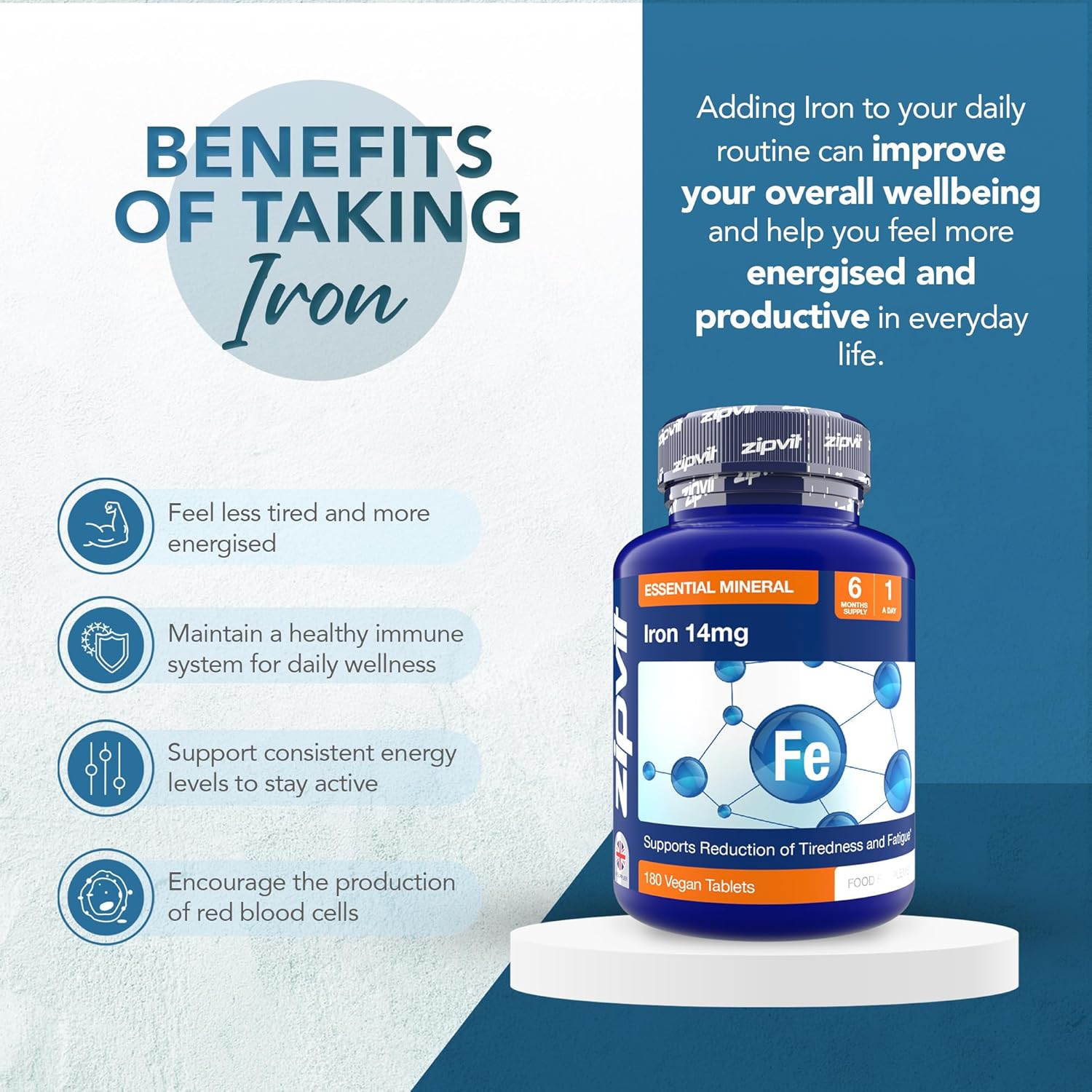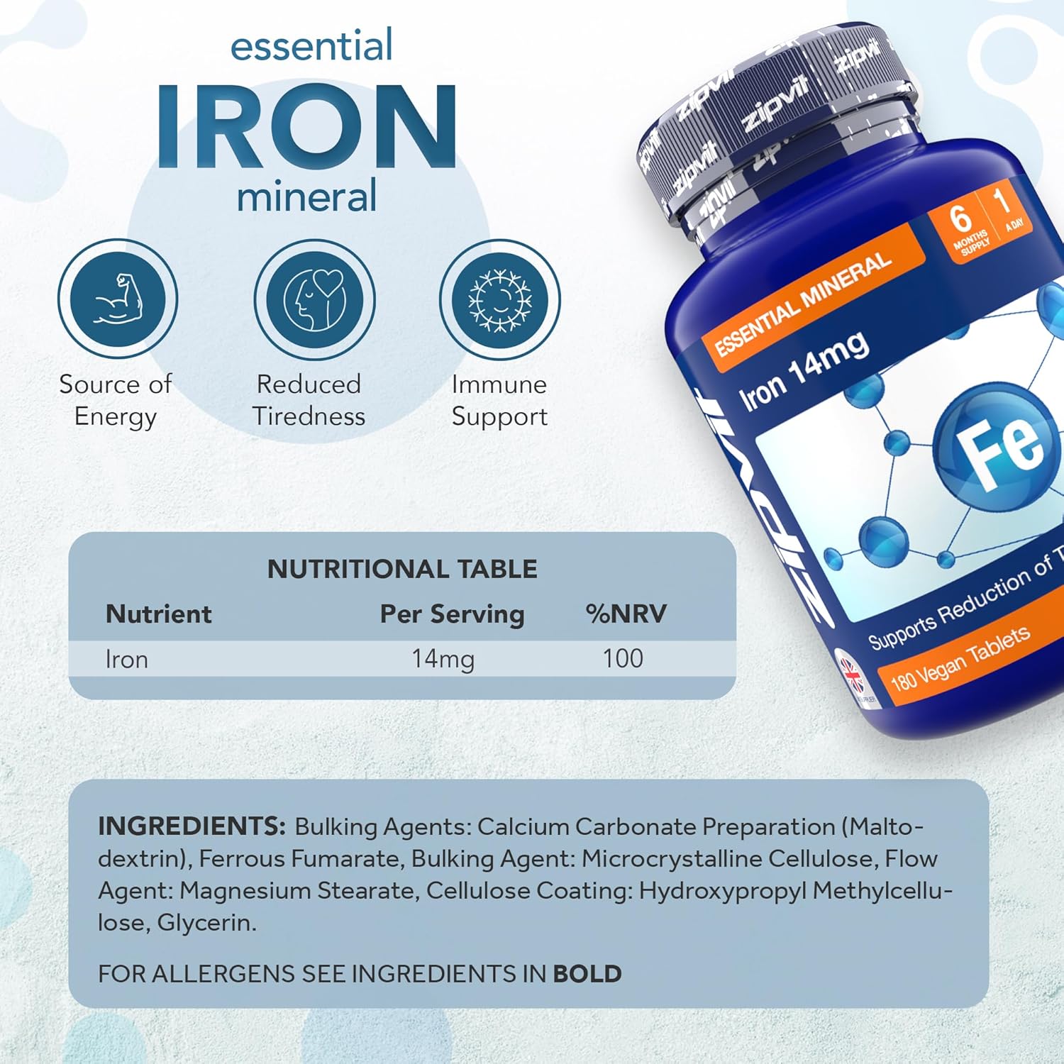 Zipvit Iron Tablets 14Mg, High Strength Ferrous Fumarate, 180 Vegan Tablets, Supports Cognitive Function & Immune System, Reduces Tiredness And Fatigue, Iron Supplements For Women And Men