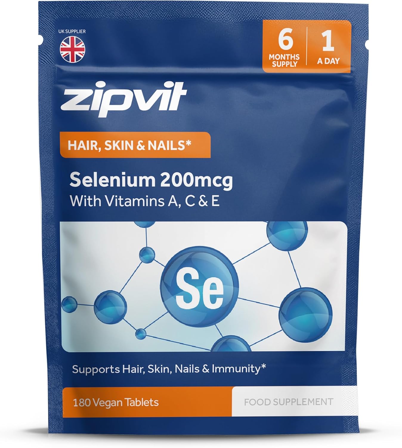 Zipvit Selenium 200Mcg With Vitamins A, C, E. 180 Vegan Tablets. Supports Normal Thyroid, Skin, Hair & Nails, Immune System, And Antioxidant Protection. 6 Month Supply