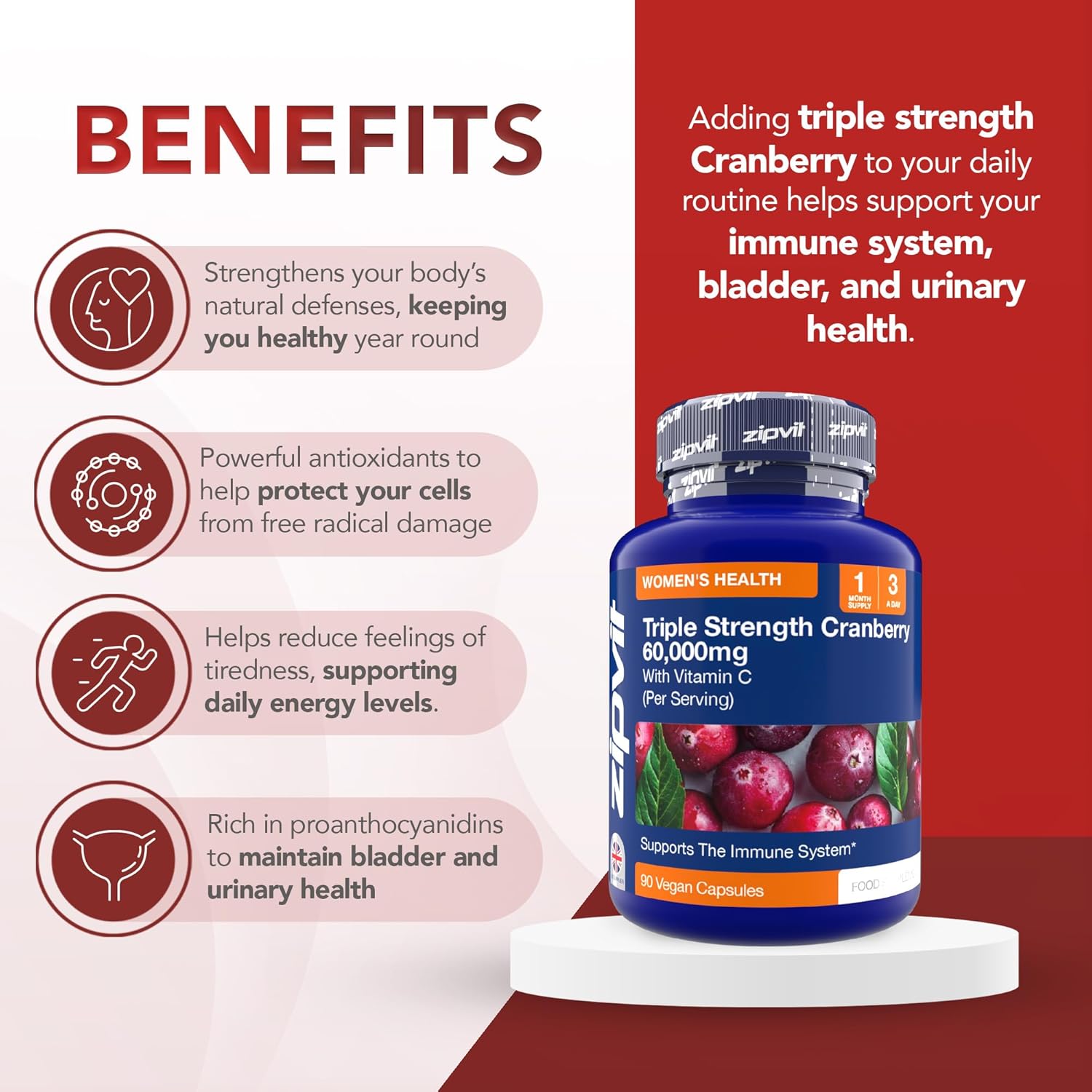 Zipvit Triple Strength Cranberry 60,000Mg, High Strength Cranberry Extract With Vitamin C, 90 Vegan Capsules For Immune Support, 1 Month Supply, Supplement For Men & Women
