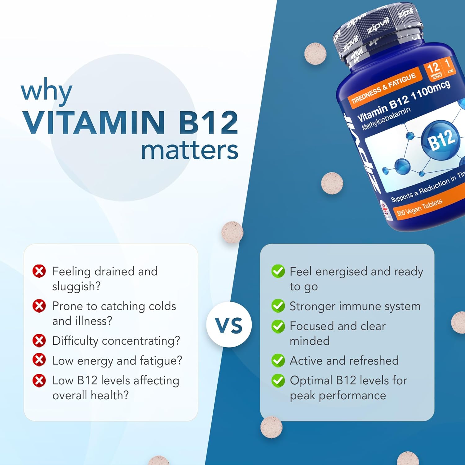 Zipvit Vitamin B12 Tablets High Strength 1100Mcg, 1 Year Supply, Pure Methylcobalamin, 360 Vegan Tablets, Reduces Tiredness, Improves Energy, Supports Immunity, Eco Pouch