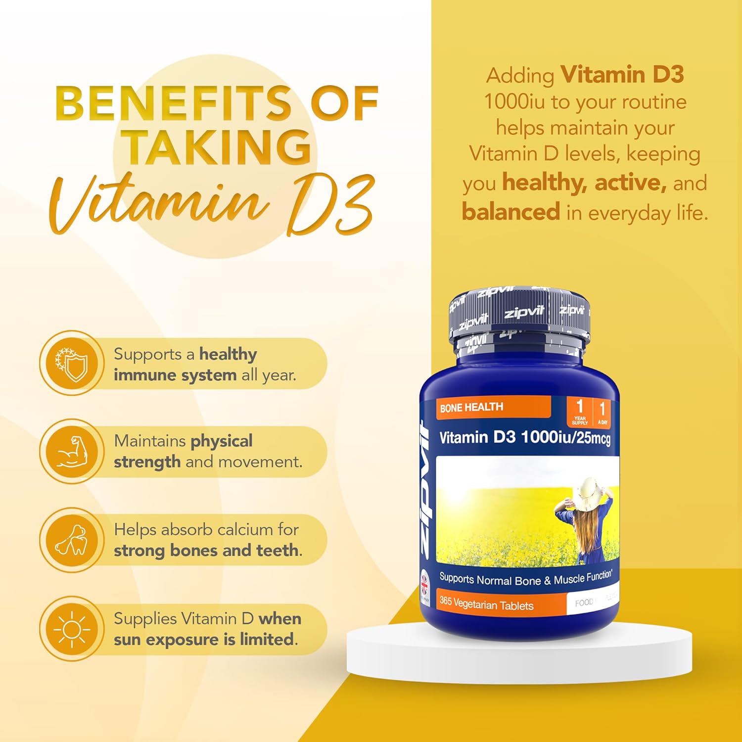 Zipvit Vitamin D 1000Iu, 1 Year Supply, 365 Vegetarian D3 Tablets, High Absorption, Easy-To-Swallow Vitamin D Tablets For Immune, Bone & Muscle Health