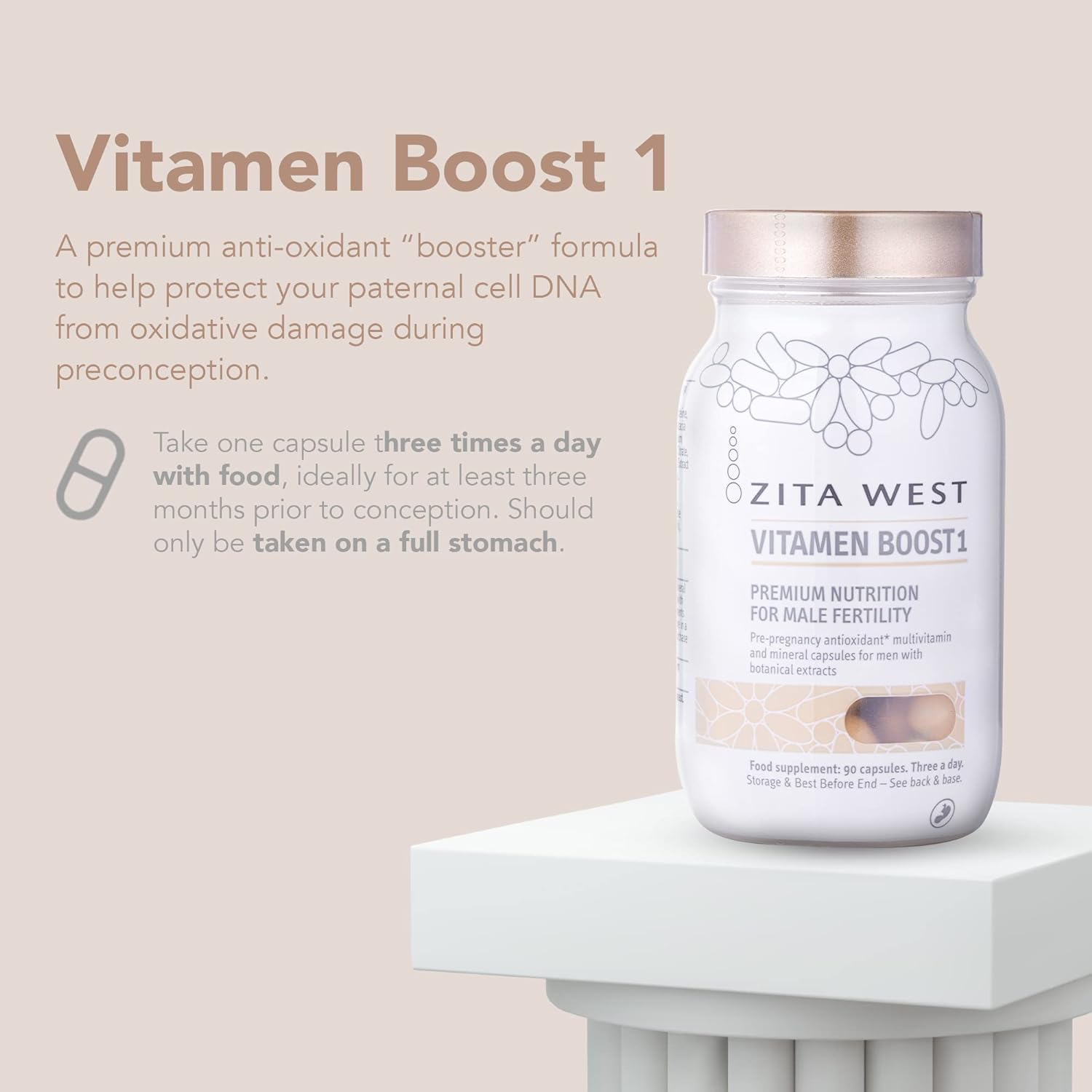 DESCRIPTION : Zita West Vitamen Boost 1 – Male Fertility and Preconception Supplement for Healthy Cell Growth – One Months Supply, 90 Capsules