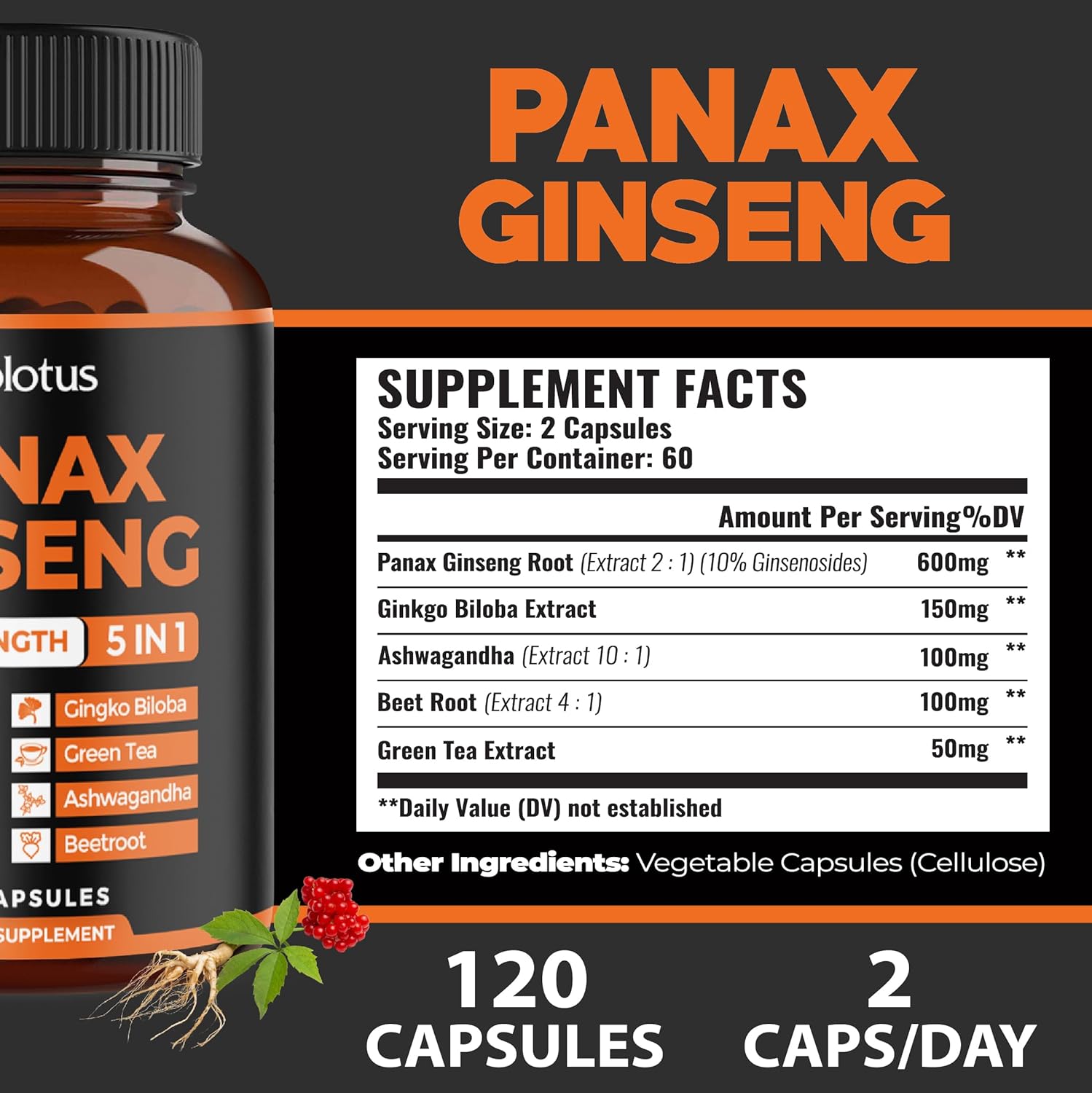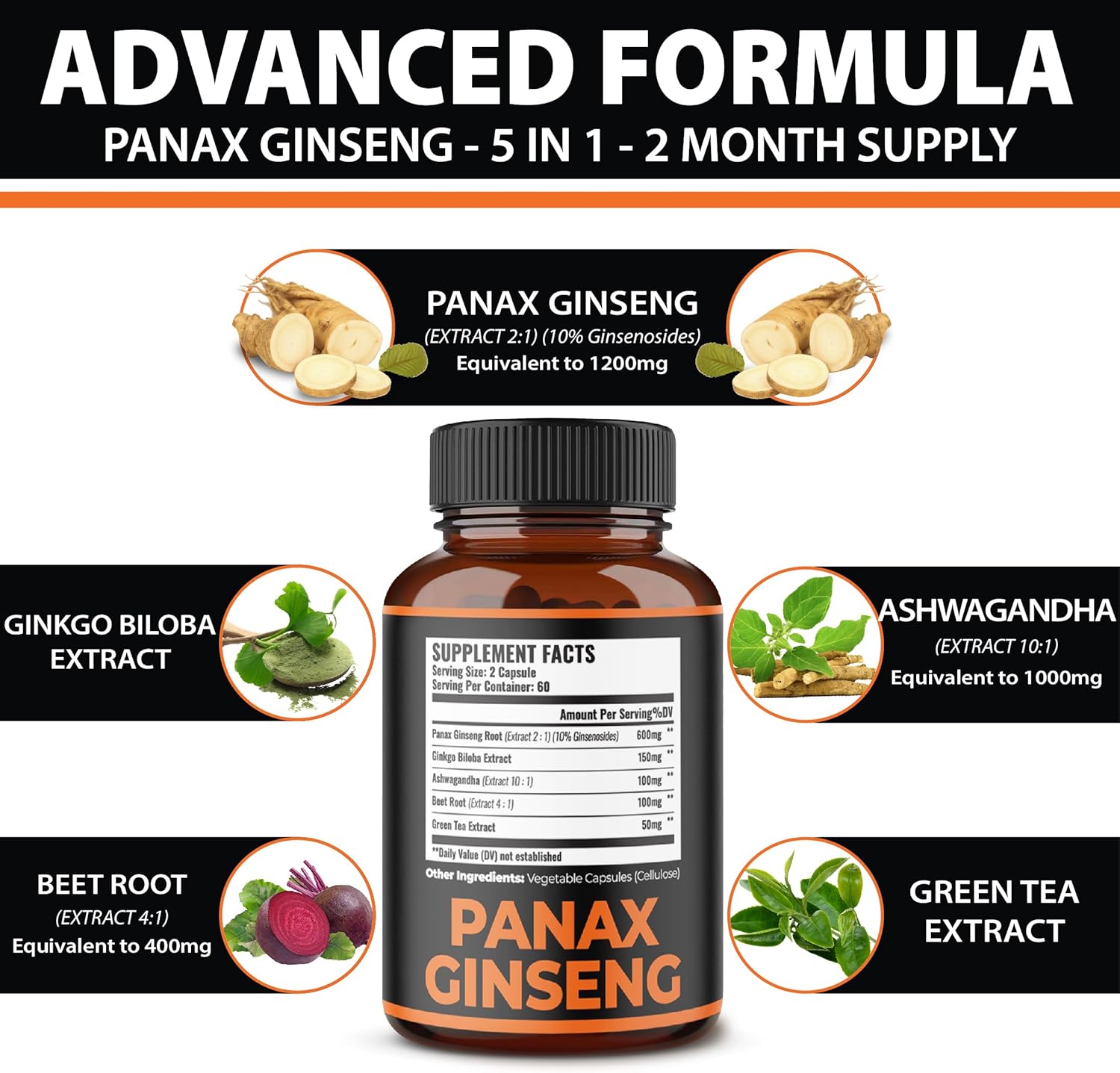 5-In-1 Special Formula: Ginseng Supplements Feature An Array Of Pure Ingredients, Including Panax Ginseng, Gingko Biloba, Ashwagandha, Beetroot And Green Tea