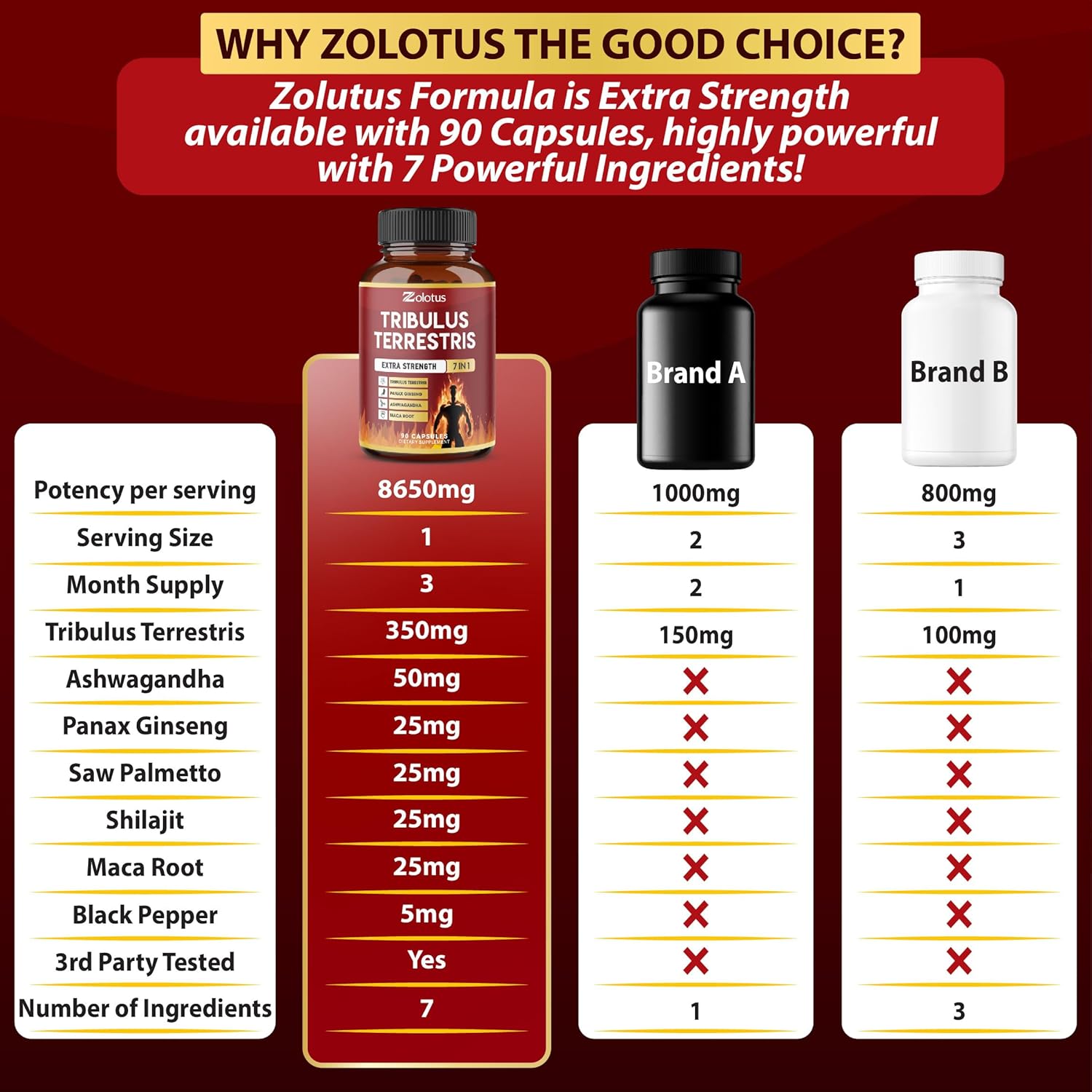 Zolotus Tribulus Terrestris, 8650Mg Per Capsule, High Potency With Ashwagndha, Panax Ginseng, Saw Palmetto, Maca, Shilajit. Boost Energy, Mood, Stamina & Performance, For Men & Women, 3 Months Supply